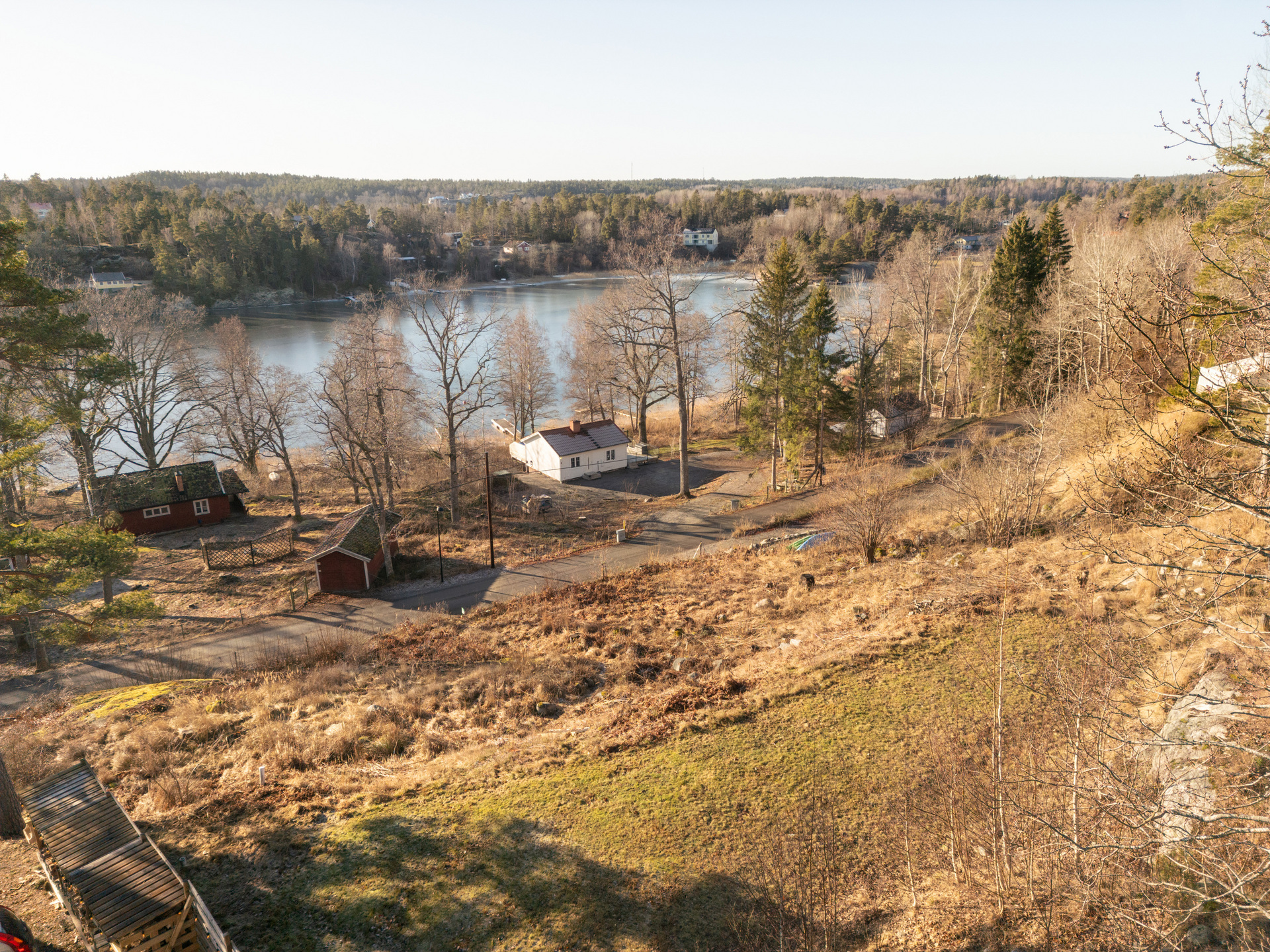 Södervänd, terrasserad tomt med sjöutsikt över Herrviken och fantastiskt solläge! Det höga läget gör att utsikten når hela vägen över till Ingarö och bidrar till fantastiska solnedgångar. Alldeles nedanför tomten går en stig till en av föreningens badstränder. Fastighetens långa gräns mot vägen möjliggör för en ny ägare att dra en egen väg långt upp på fastigheten, i likhet med intilliggande fastighet.