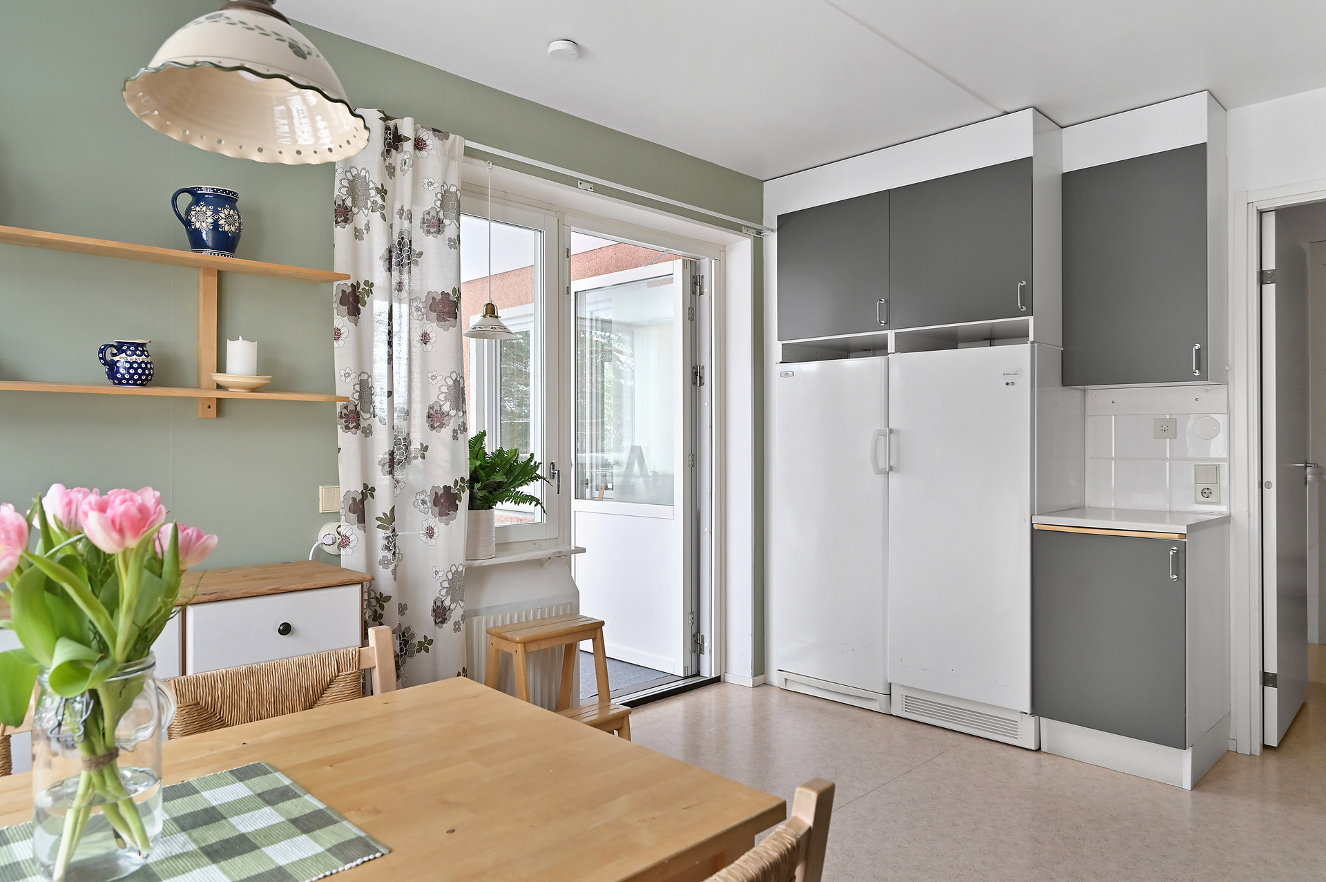 Lägenhetens planlösning är väl genomtänkt med generös golvyta i alla rum vilket i kombination med generös fönstersättning gör detta till ett hem att trivas i. Planlösningen disponeras över en möblerbar hall med gott om plats för avhängning samt en rymlig klädkammare. Det rymliga köket har nylackerade skåpsluckor och gott arbetsytor. Varma dagar flyttar man gärna ut till den inglasade balkongen som rymmer både matgrupp och vilstolar. Vardagsrum med ekparkett och härligt ljusinsläpp från flera fönster. Sovrummet är luftigt med plats för dubbelsäng, sängbord och gott om garderober. Kaklat duschrum med duschhörna, wc och handfat. Plats finns för tvättmaskin.