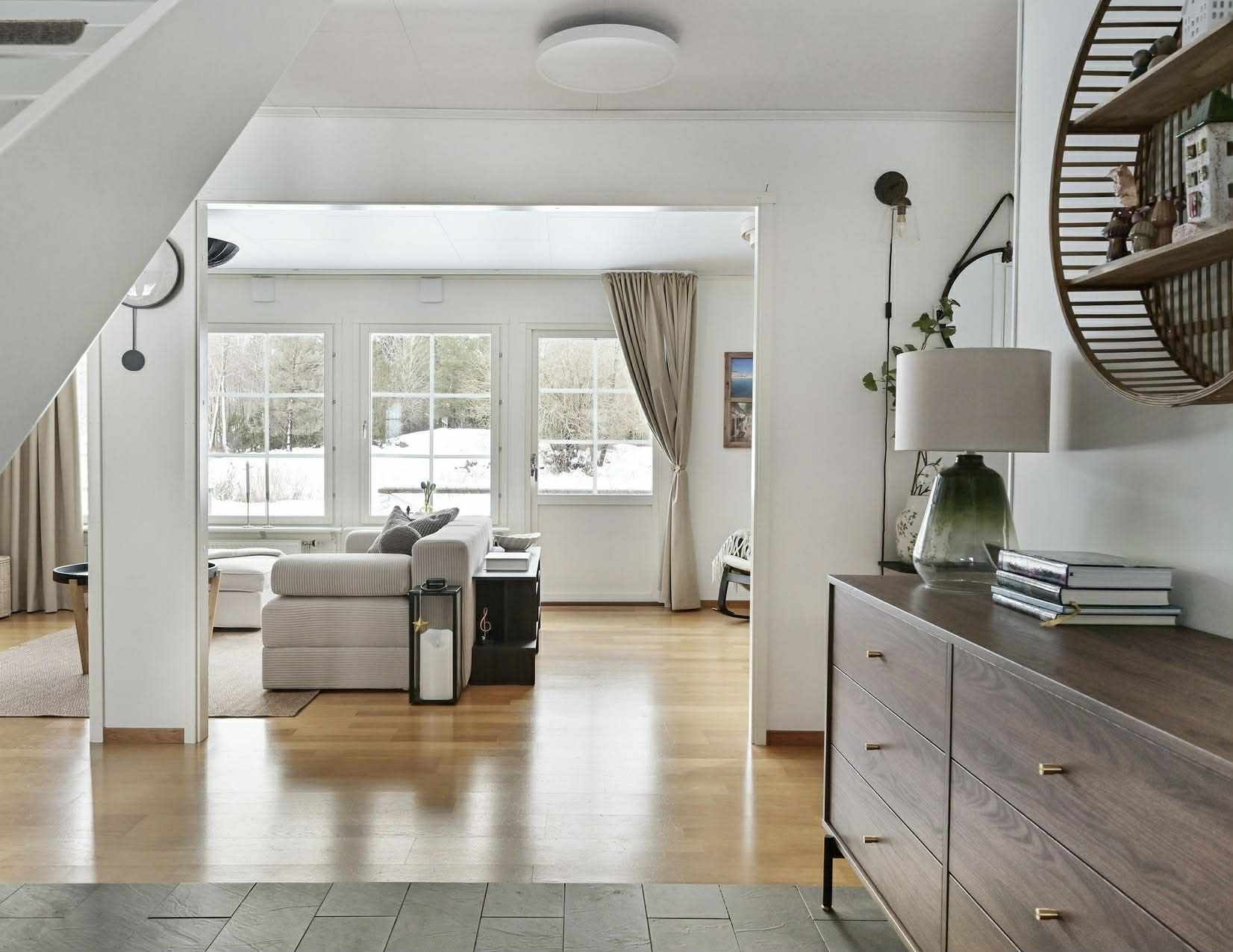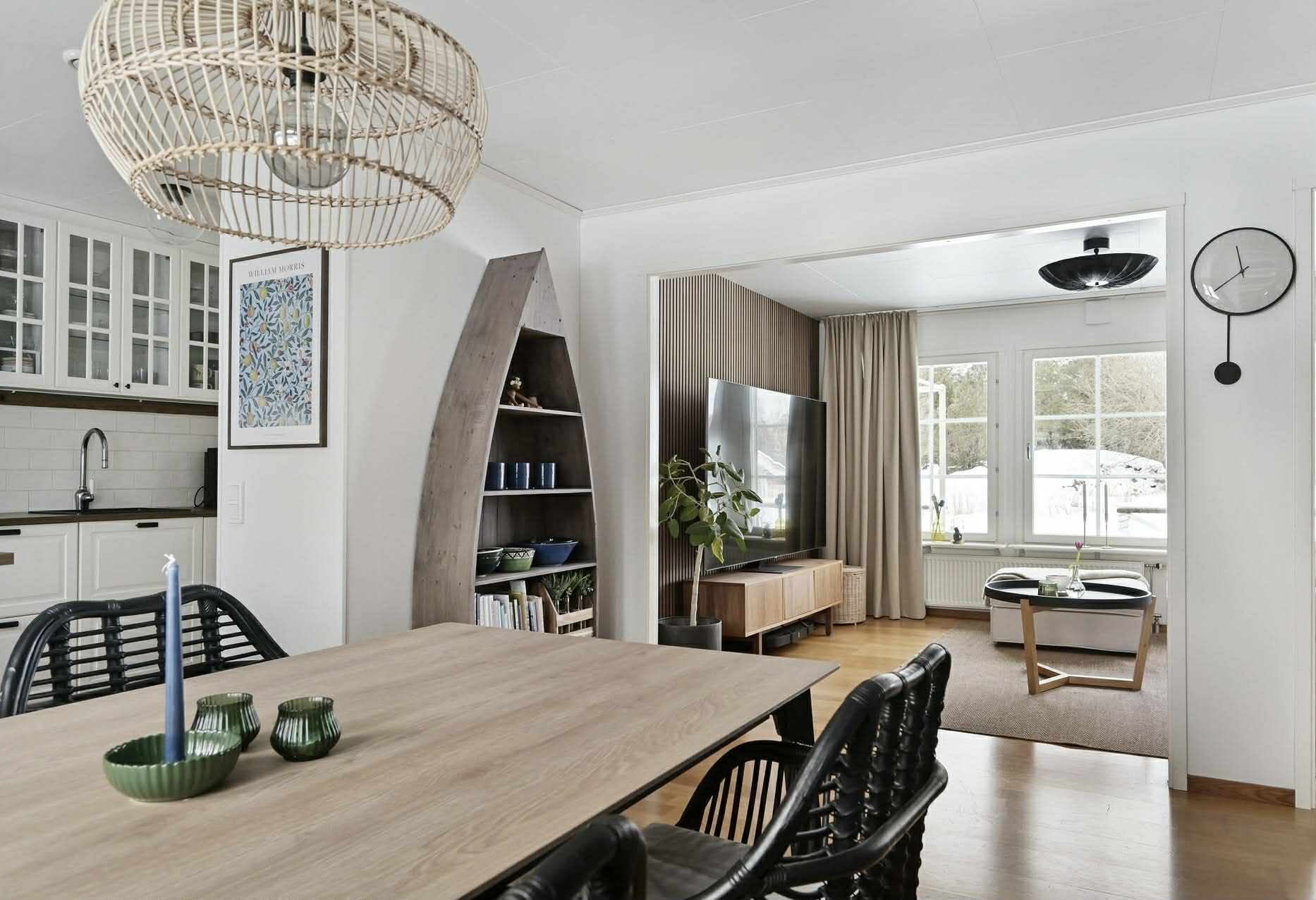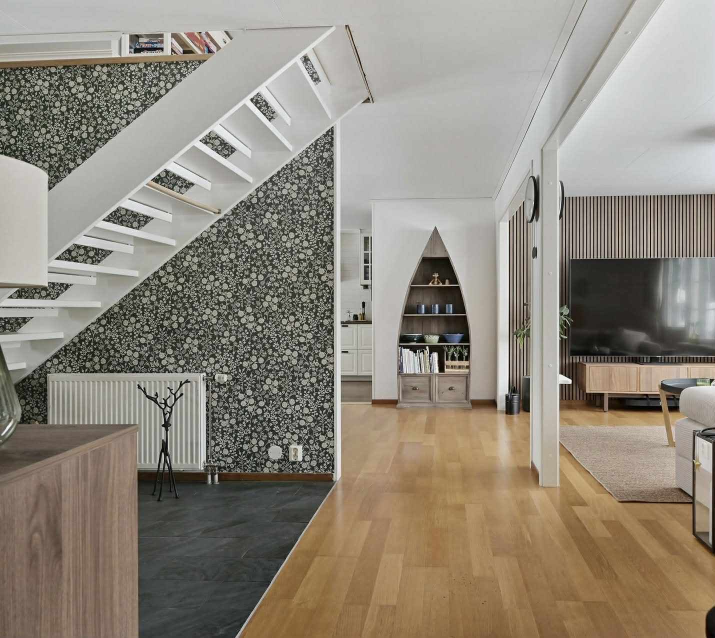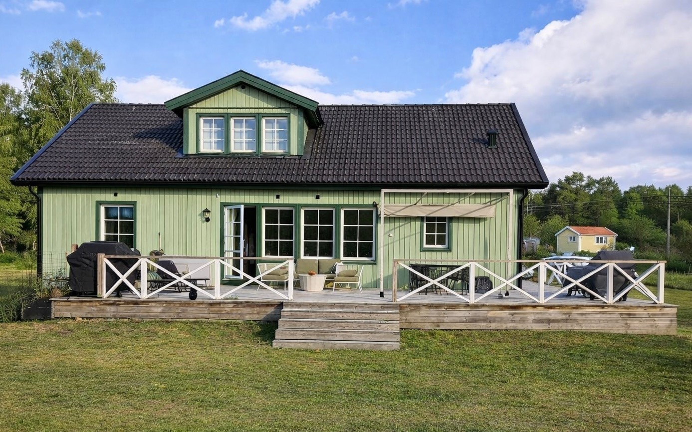 Entréplan – socialt, funktionellt och välplanerat Entré via farstukvist till möblerbar hall med klinkergolv som övergår i ekparkett. Här finns gott om plats för ytterkläder och en tydlig känsla av ordning och funktion. Kök och vardagsrum ligger i delvis öppen planlösning med generöst ljusinsläpp från fönster i flera väderstreck. Från vardagsrummet nås den stora altanen som löper runt nästan hela huset – en naturlig förlängning av bostaden under sommarhalvåret. Det smakfullt renoverade köket (2022) är hemmets självklara samlingspunkt. Vita lantliga luckor, belysta vitrinskåp, goda arbetsytor och en bred bardel skapar en social och trivsam miljö. Här finns hel kyl och frys, spishäll med inbyggd ugn, fläkt samt diskmaskin. I anslutning ligger en rymlig tvättstuga med groventré – praktiskt placerad och utrustad med värmepanna, tvättmaskin, torkskåp, tvättho och gott om förvaring. Entréplanet rymmer även två sovrum samt ett helkaklat badrum med golvvärme, badkar, dubbla handfat och handdukstork. ________________________________________ Övre plan – luftigt och flexibelt Övre plan möter dig med ett stort och ljust allrum med burspråk mot trädgården. Här finns möjlighet till tv-rum, lekyta eller arbetsplats. Tre rymliga sovrum ger gott om plats för familj och gäster. Det större sovrummet har öppet upp till nock, takfönster och installerad luftvärmepump för både värme och kyla – en komfortfaktor under årets alla säsonger. Helkaklat badrum med golvvärme, dusch, wc och kommod. I anslutning finns ett utrymme med möjlighet att inreda bastu om så önskas. Praktiska kattvindar ger extra förvaring. ________________________________________ Utemiljö – generös och väl omhändertagen Altanen löper runt nästan hela huset och skapar flera naturliga sittplatser i olika väderstreck. Här finns plats för både lugna morgnar och sociala grillkvällar. Tomten erbjuder fina gräsytor för lek, odling och avkoppling. Uppfarten har nyligen breddats och rymmer upp till fyra bilar. Laddstolpe för elbil är installerad. Fiber är indraget för stabil uppkoppling och smidigt distansarbete. Utförda förbättringar – ett välskött hem Nuvarande ägare har kontinuerligt förbättrat och underhållit huset: 2022 – Nytt kök inklusive vitvaror 2022 – Installation av luftvärmepump 2022 – Installation av fiber 2023/2025 – Målning av ytskikt inomhus 2023 – Tapetsering matrum och hall 2023 – Förråd ca 15 kvm uppfört 2024 – Installation laddstolpe 2024 – Utökad el och utebelysning 2024 – Ommålad fasad 2025 – Ny och breddad uppfart 2025 – Nytt trädäck som sammanfogar fram- och baksida Detta är ett hem där mycket redan är gjort – en trygg investering för nästa ägare.