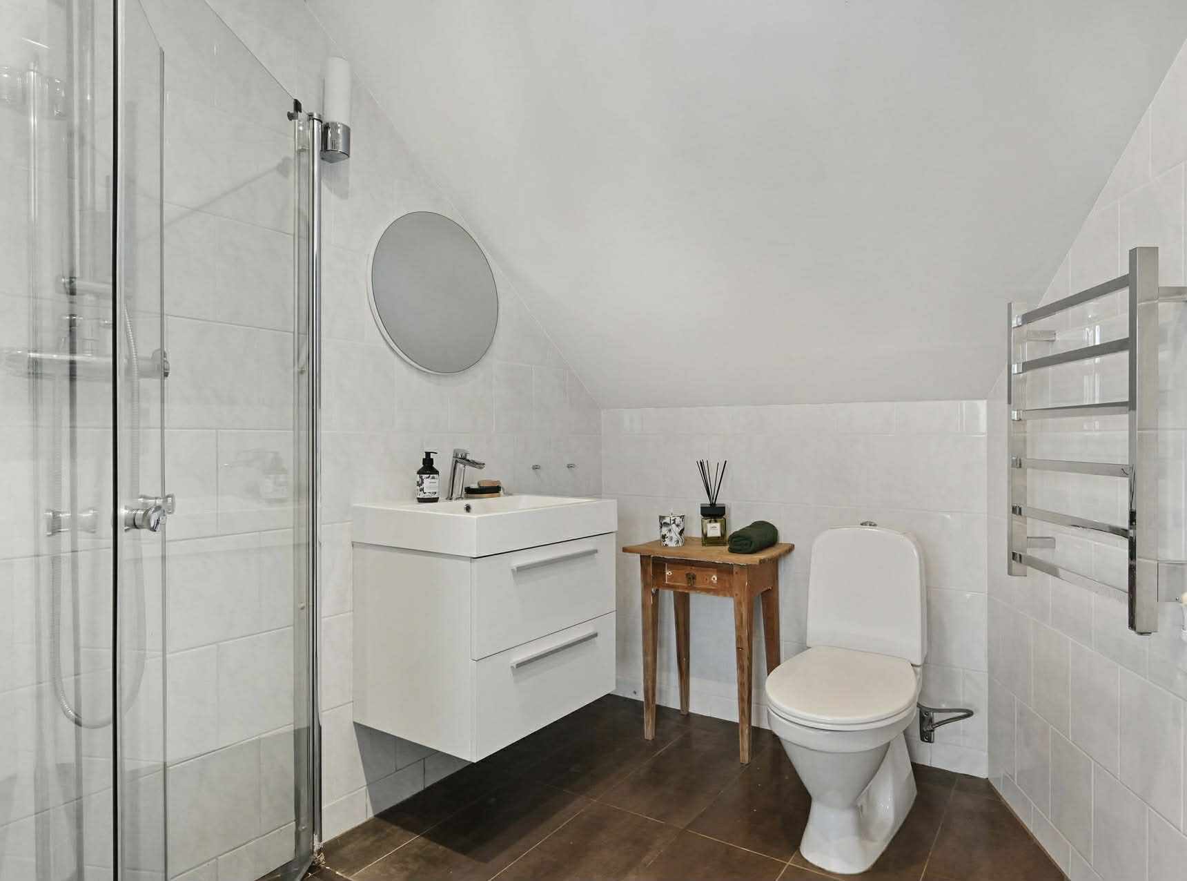 - Uppvärmning: Typ av uppvärmning: Vatenburen värme, luftvärmepump, el-golvvärme i badrum..
