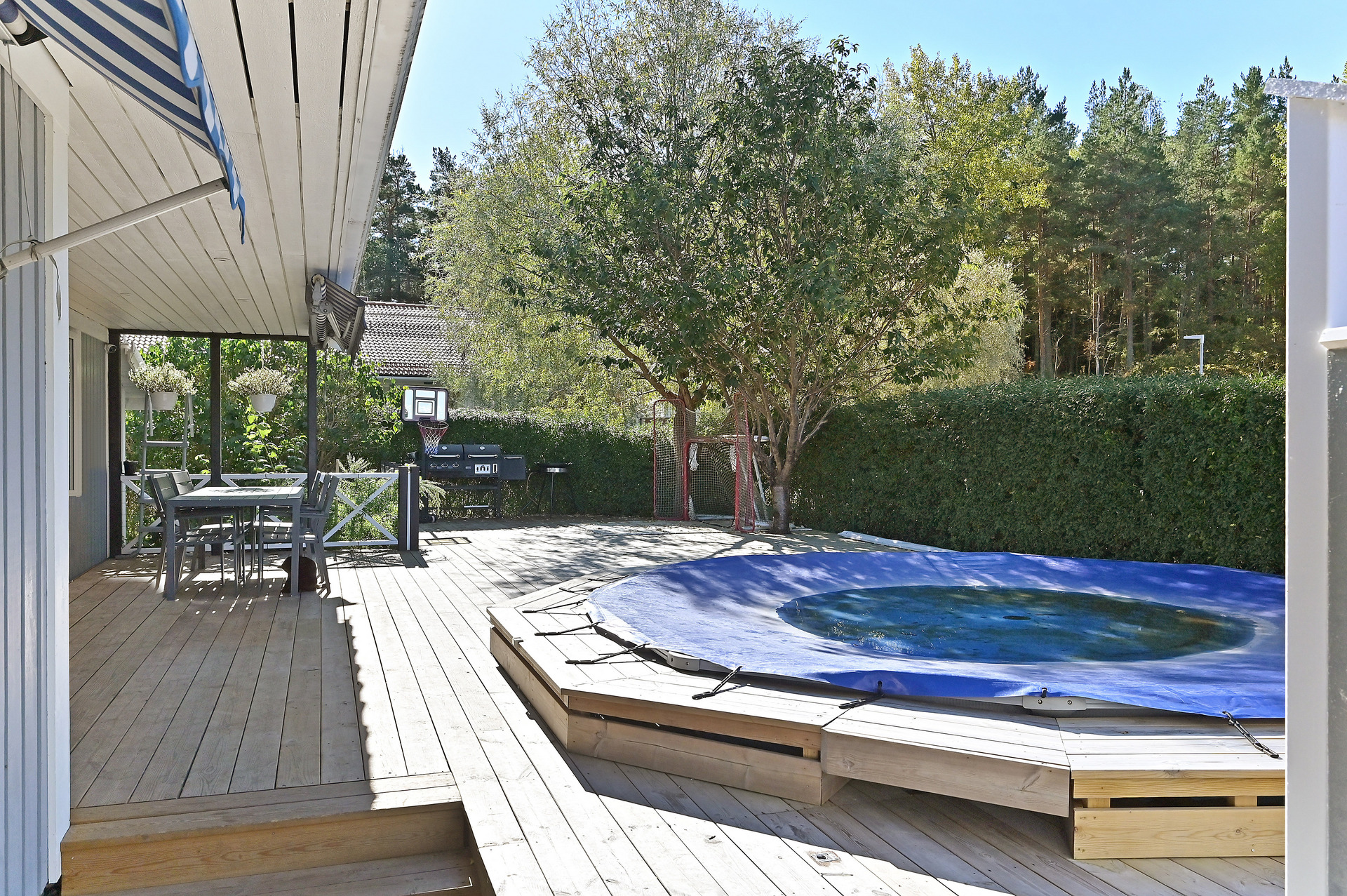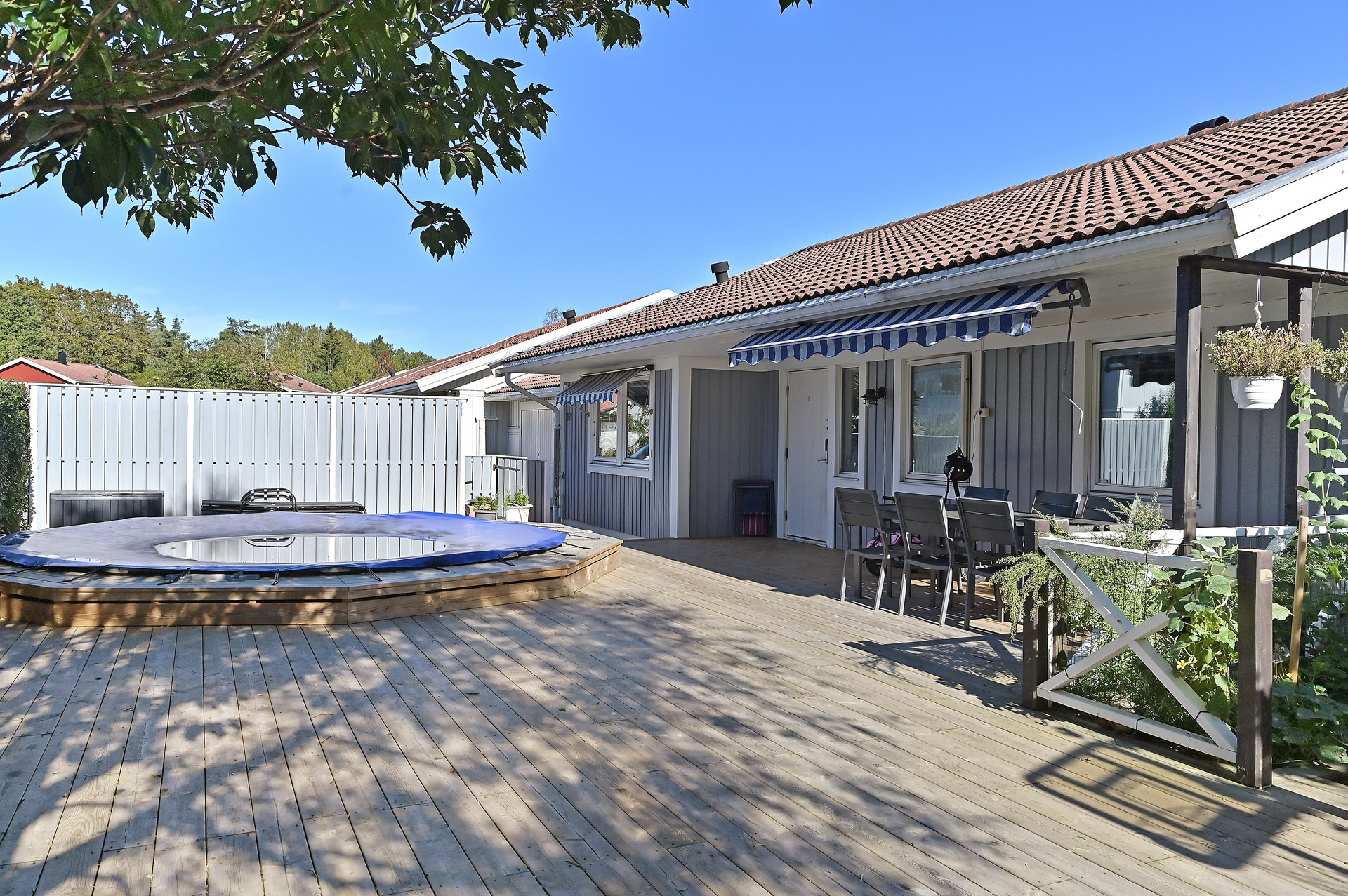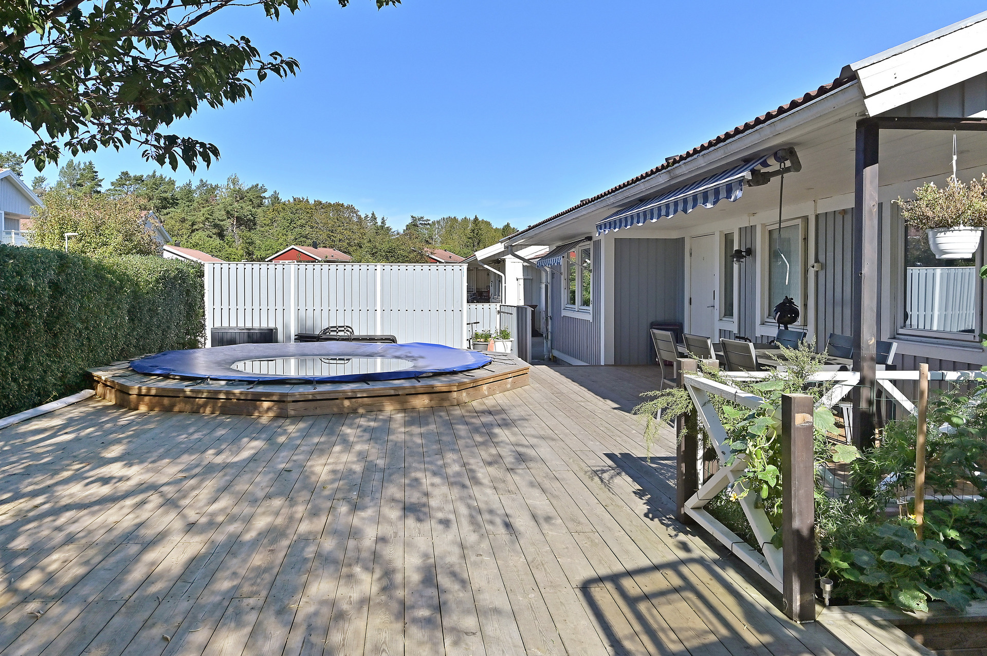 Mysig och insynsskyddad hörntomt som har en riktigt stor altan på entrésidan med en inbyggd pool för härliga sommardagar.