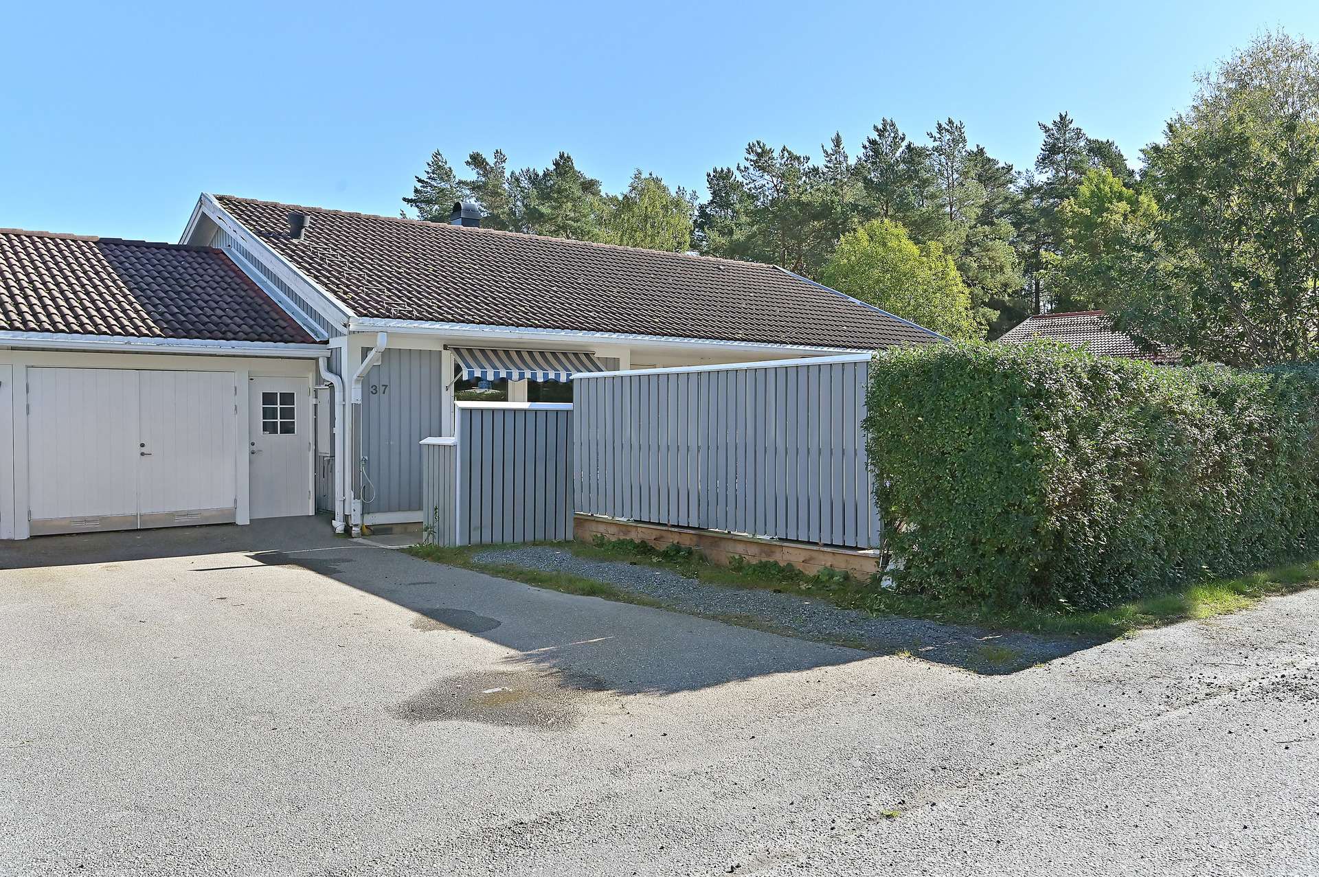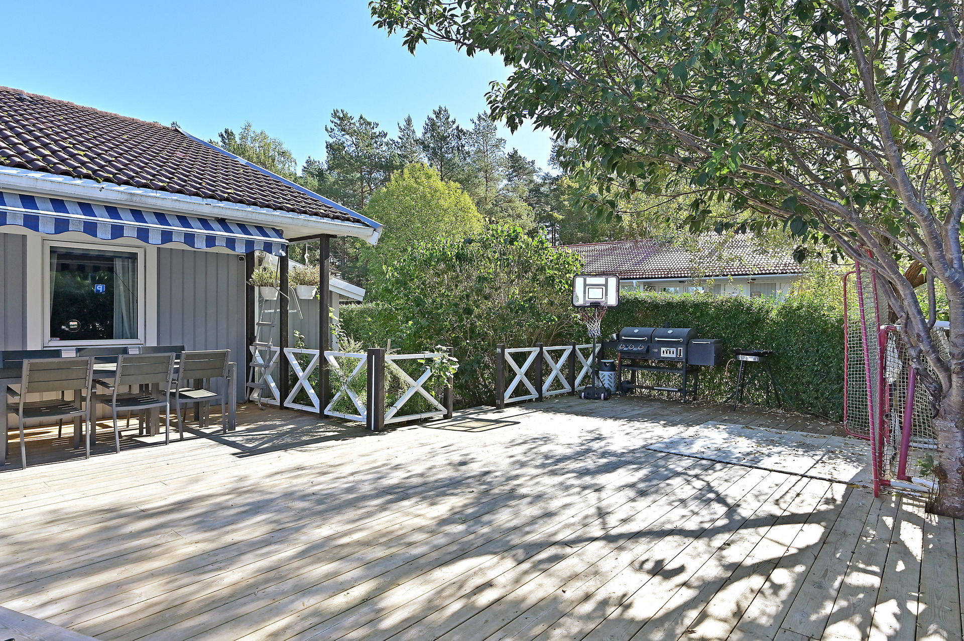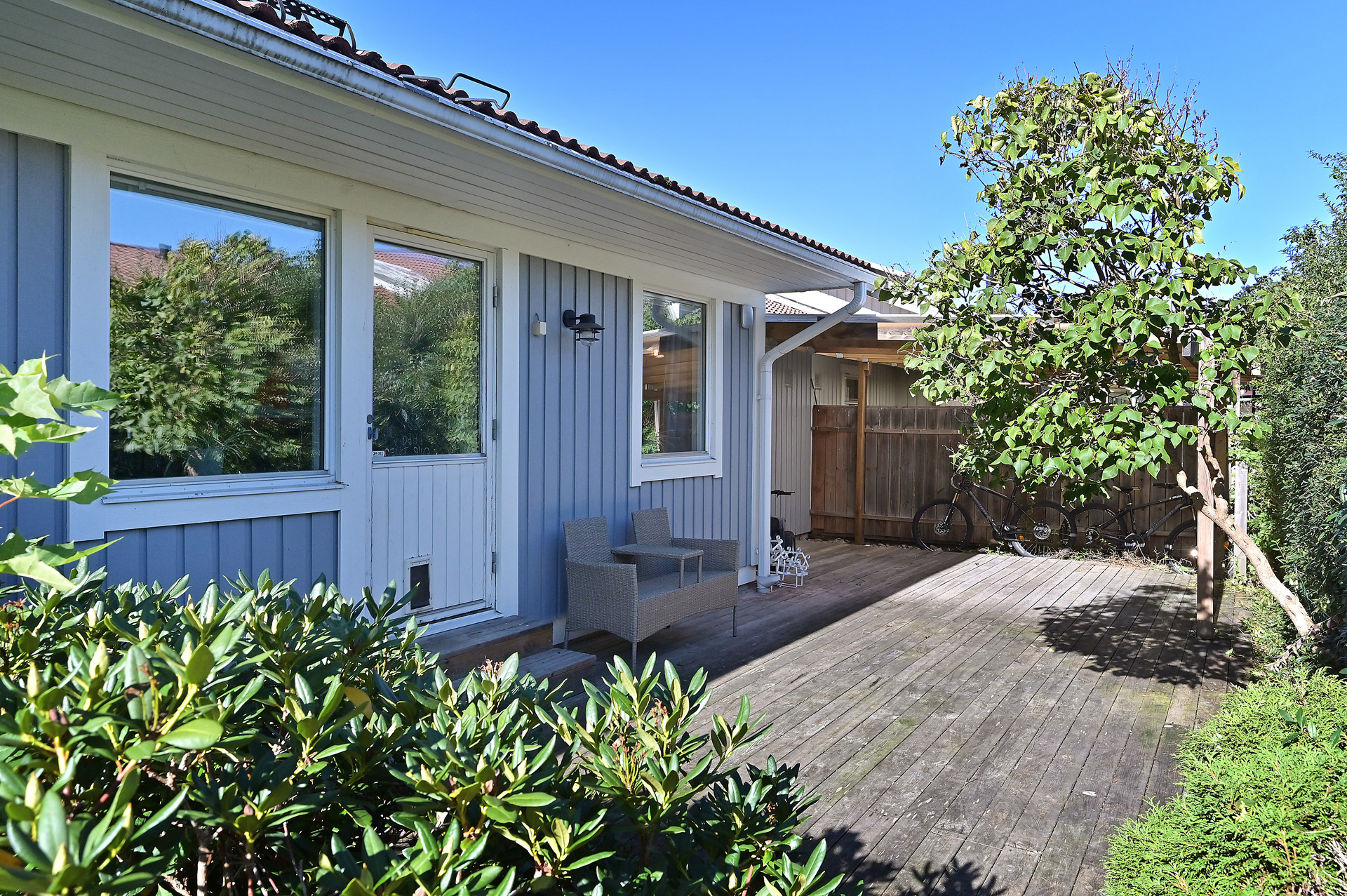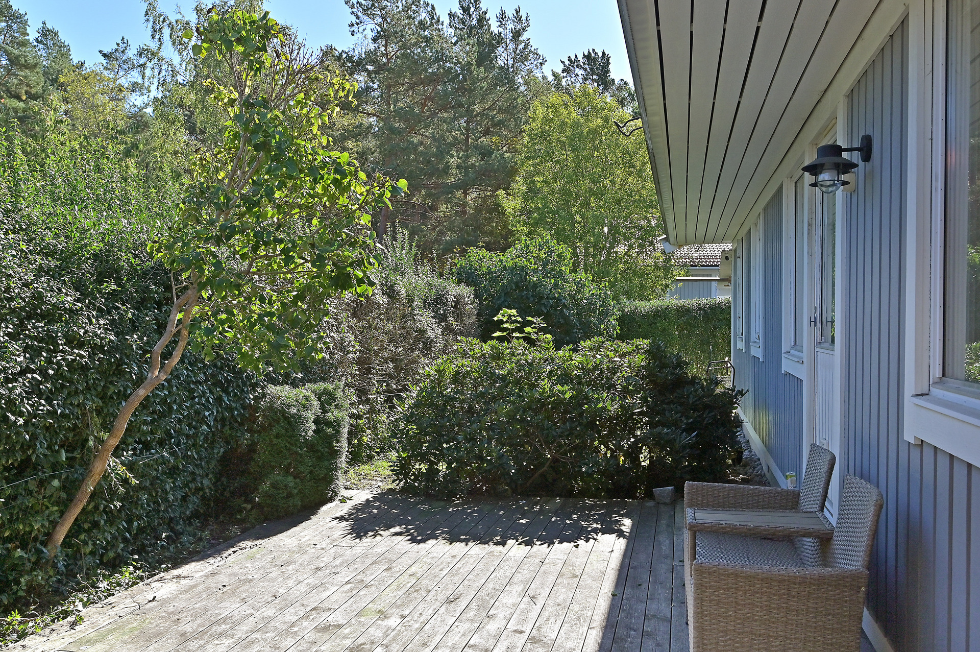 Mysig och insynsskyddad hörntomt som har en riktigt stor altan på entrésidan med en inbyggd pool för härliga sommardagar.