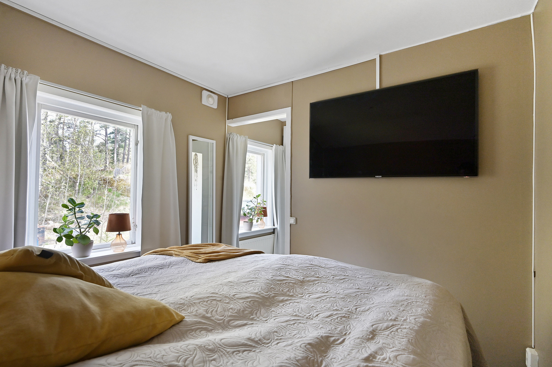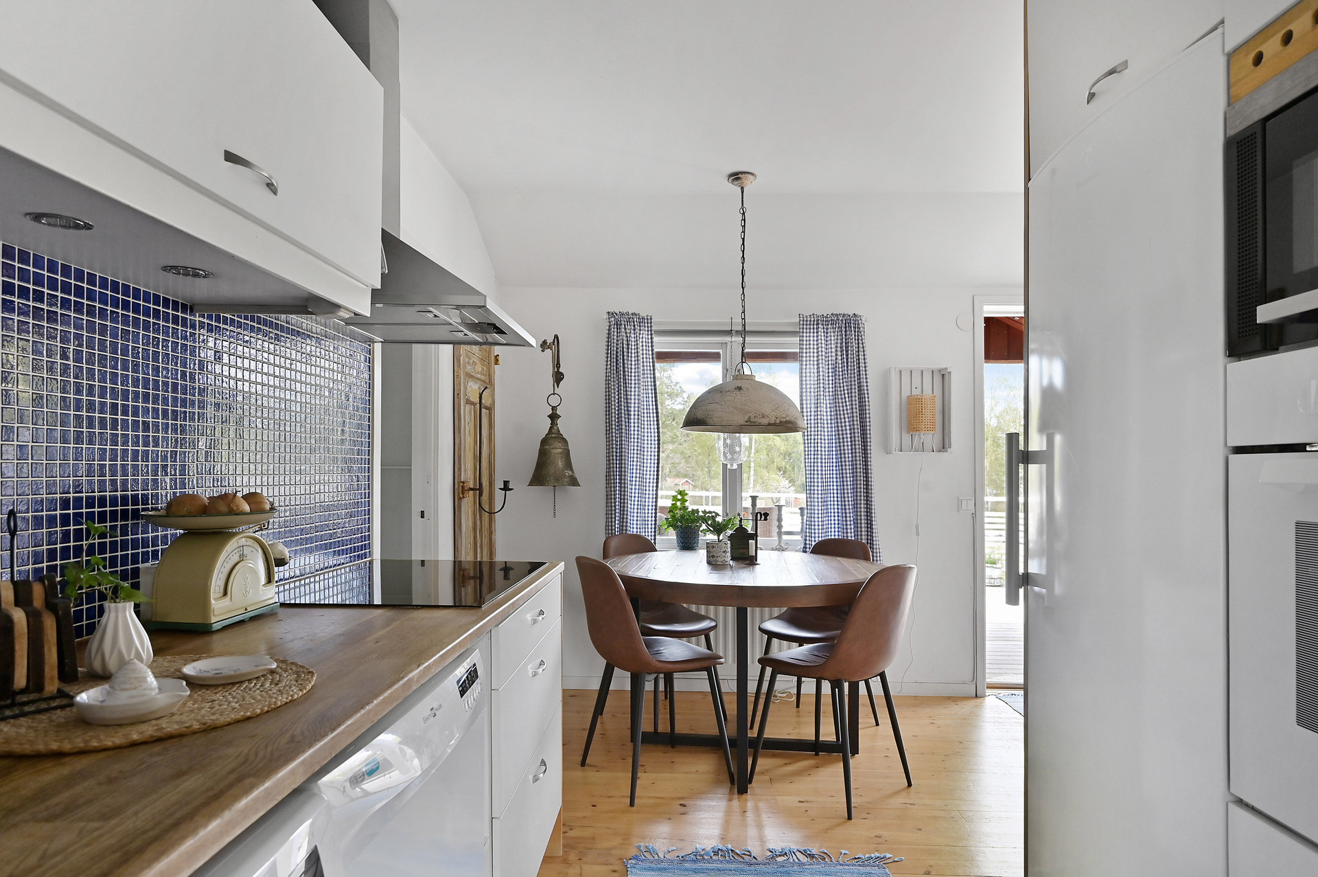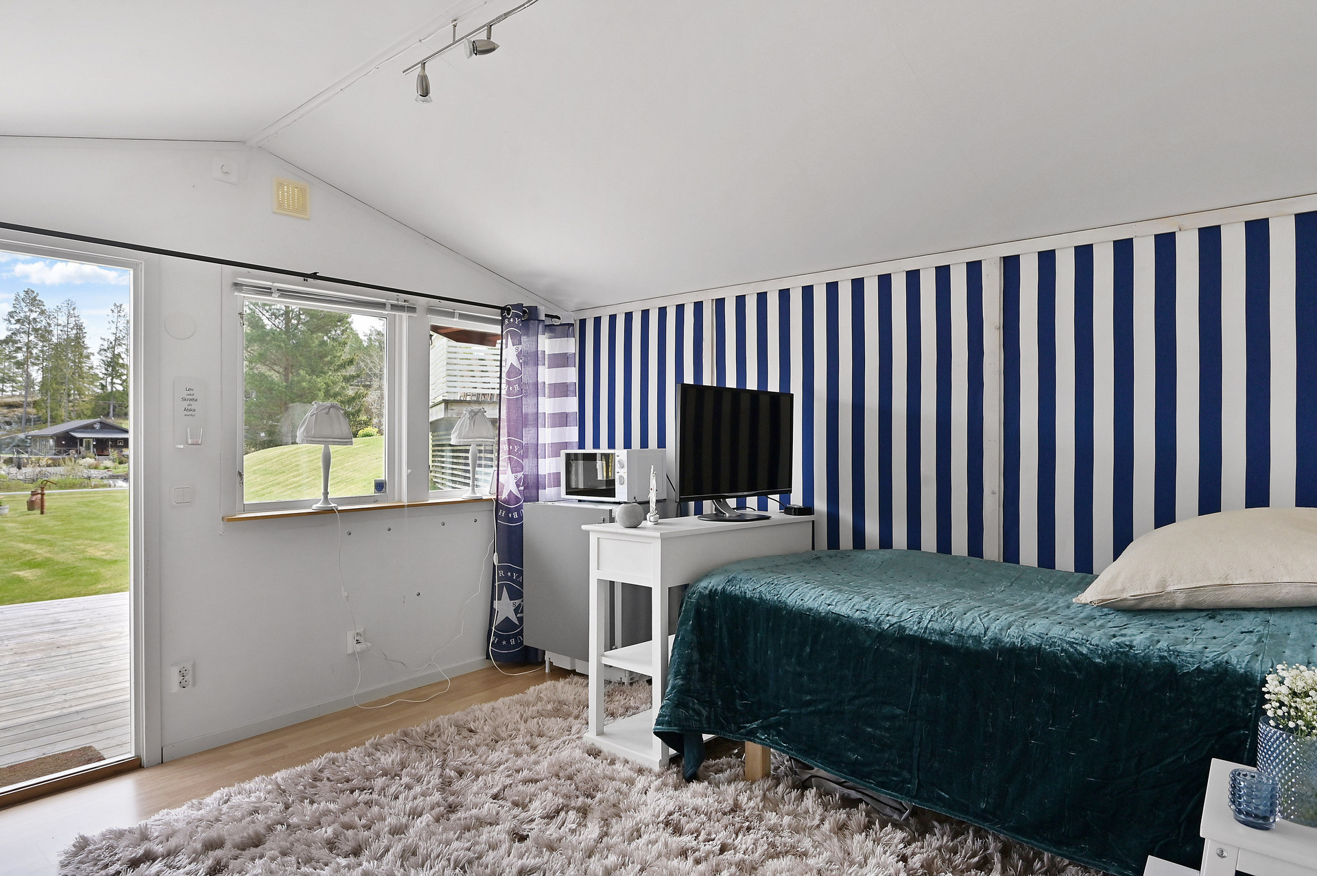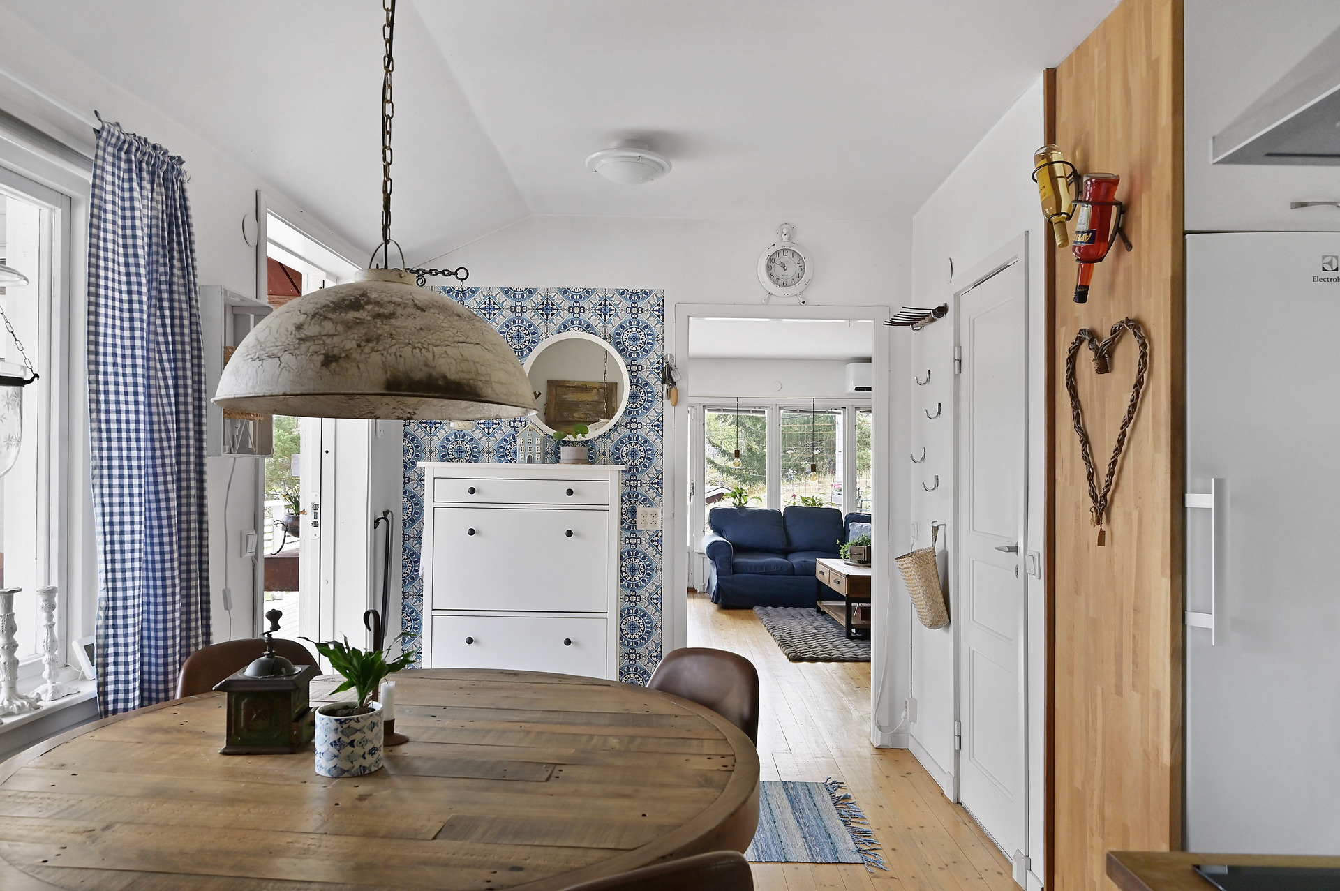 Öppen entré med kök och matplats. Här möts man av plankgolv och vitmålade väggar och tak med inslag av blå dekor. Köket är inrett med vit skåpinredning köksbänkar i ek med blå mosaik upp bakom spisfläkt och överskåp. Köket är utrustat med hel kyl, diskmaskin, spishäll med spisfläkt ovanför samt en tvättmaskin, längst in i köket finns ett fönster ut mot baksidan. I anslutning till köket finns en matplats vid fönster ut mot entrésidan. Till vänster om kök och entré finns ett stort luftigt vardagsrum med fönster i två väderstreck och ett stort fönsterparti samt utgång till altan som delvis är undertak. I vardagsrummet finns en fin braskamin som tillsammans med en luftvärmepump sprider värmen in i hela huset när man eldar, perfekt kalla vinterkvällar. Vardagsrummet har vitmålade väggar och plankgolv. Till höger om köket finns ett sovrum som nås via en "Walk in closet" med heltäckningsmatta och gott om förvaring bakom skjutbara dörrar längst ena väggen. I sovrummet finns plats för dubbelsäng och även här har man en heltäckningsmatta att värma fötterna på när man stiger upp på morgonen. Mellan kök och vardagsrum finns ett helkaklat badrum med dusch, badrummet renoverades i egen regi 2011 och har ett grått klinkergolv (el-golvvärme) med vitt kakel på väggarna och gråa kaklade detaljer. Här finns även tvättställ i kommod med spegelskåp ovanför, wc samt handdukstork. På baksidan om huset finns ett litet förrådsutrymme med hyllsystem, här står även frysen. Utförda renoveringar: Köket renoverat även flyttat en vägg år 2010 Badrummet renoverat med värmegolv Och handdukstork år 2010 Vardagsrummet renoverat 2010 Byte av kamin år 2010 Slipat alla golv år 2010 Byggt Gäststuga år 2011 Bytt panel och tilläggs isolerat huset år 2012 Byggt Altan år 2012 Lagt ny gräsmatta år 2014 Byggt 2 st förråd år 2018 Gjort trappa till entrén i Granitsten år 2021 Ny uppfart med Granit kantsten år 2021 Byggt garage påbörjat 2017 klart 2021 Sovrummet renoverat 2024