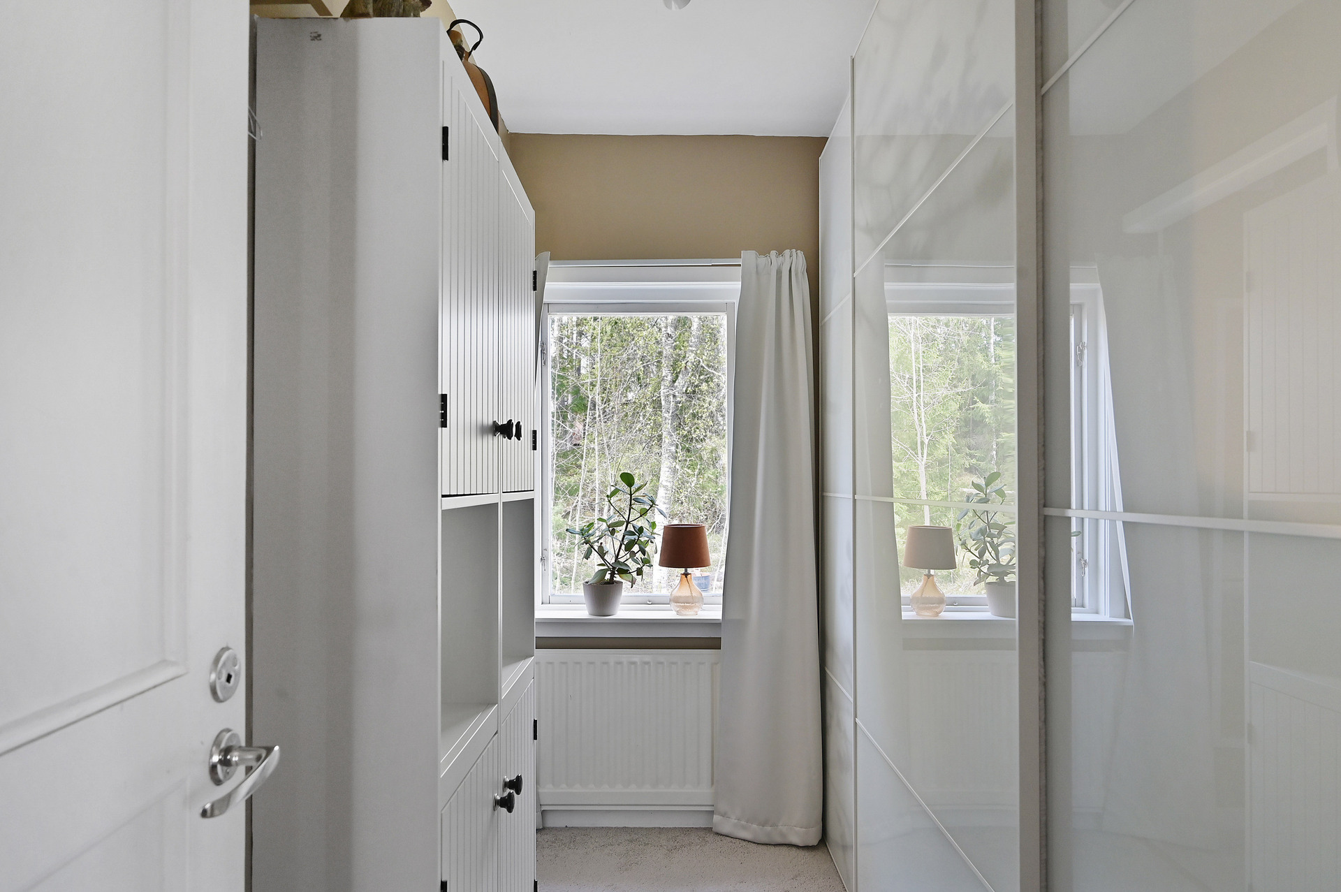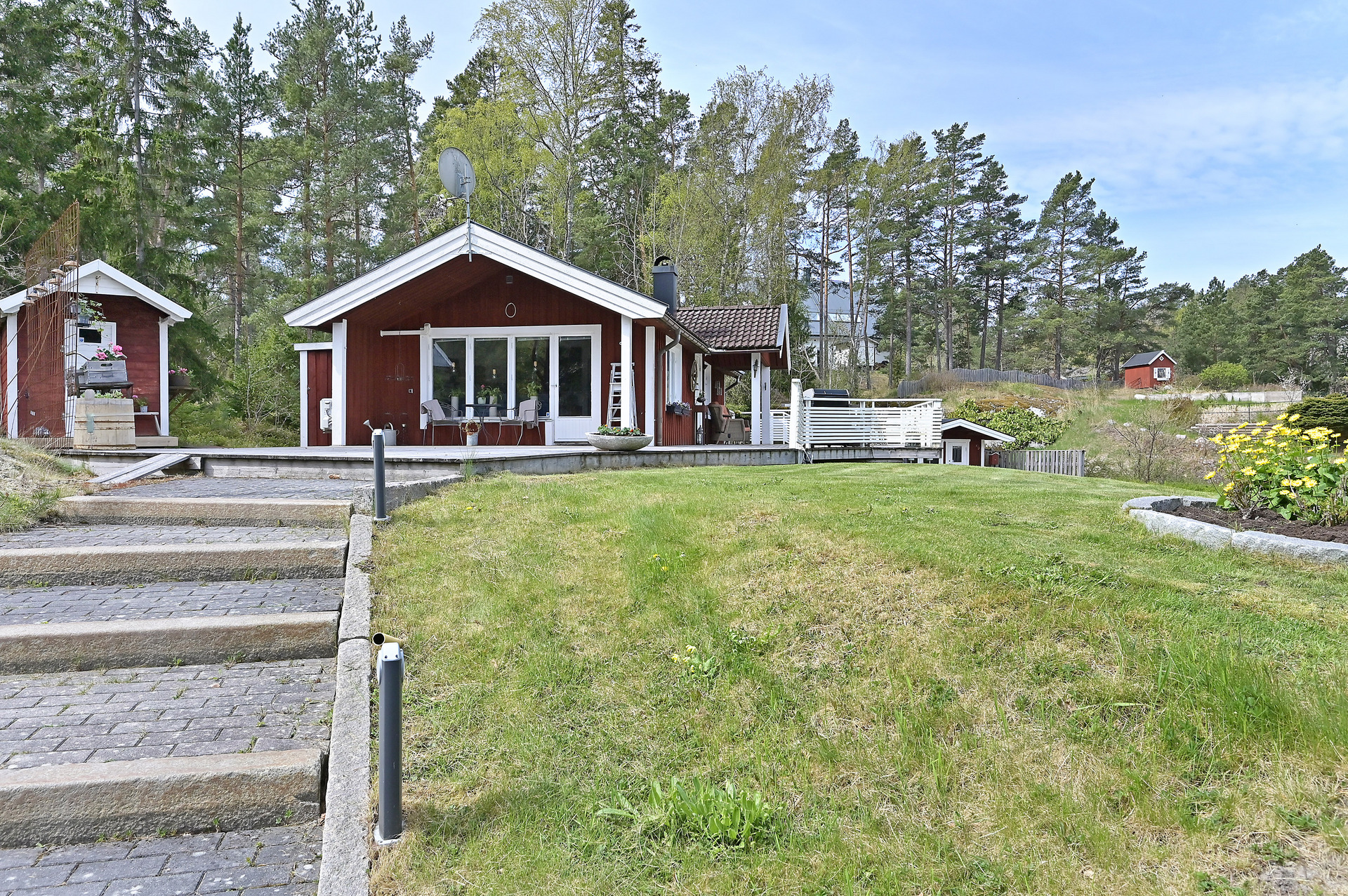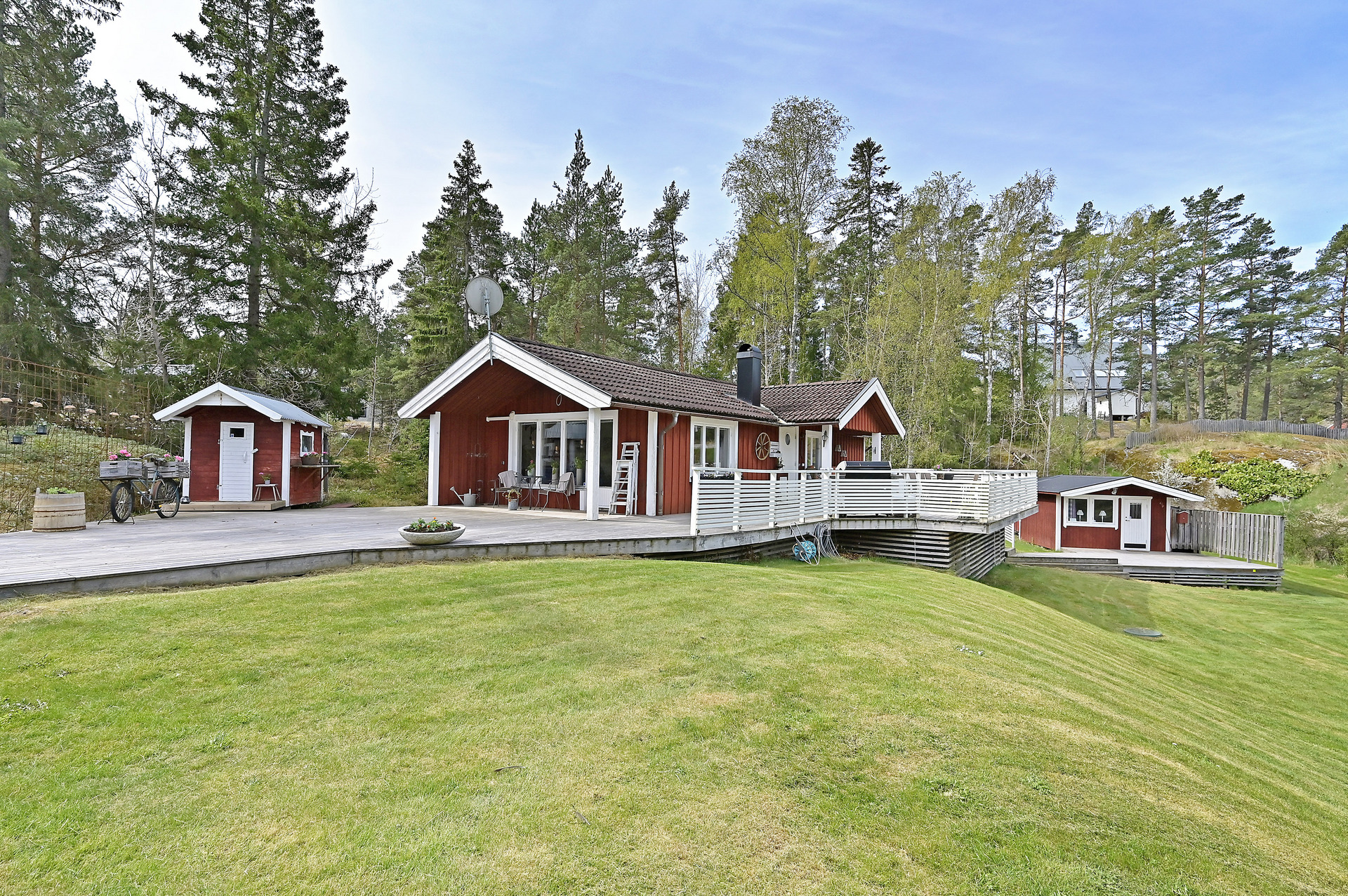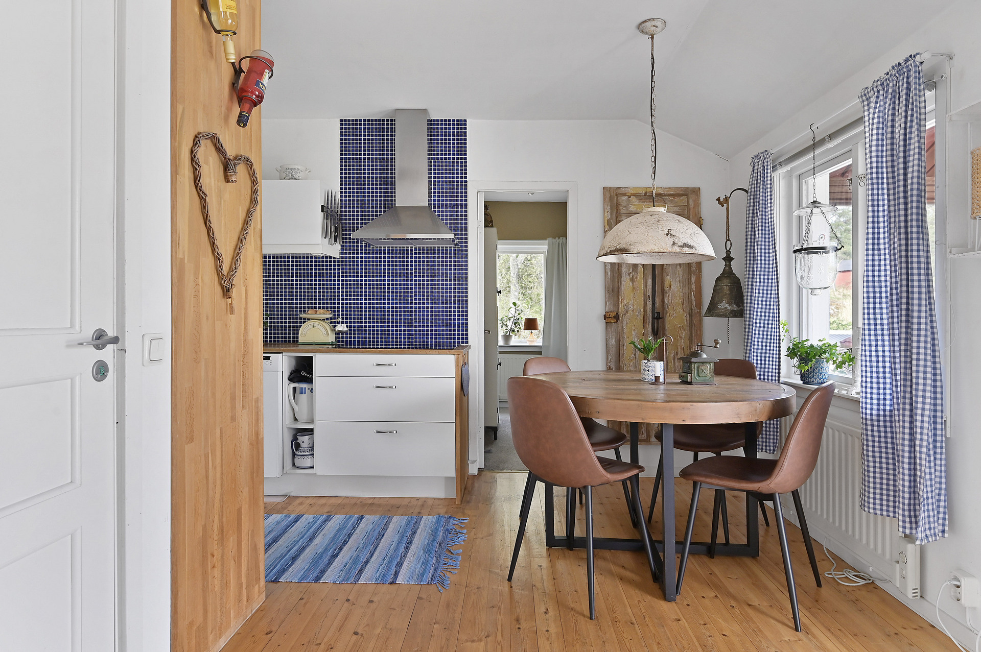 Öppen entré med kök och matplats. Här möts man av plankgolv och vitmålade väggar och tak med inslag av blå dekor. Köket är inrett med vit skåpinredning köksbänkar i ek med blå mosaik upp bakom spisfläkt och överskåp. Köket är utrustat med hel kyl, diskmaskin, spishäll med spisfläkt ovanför samt en tvättmaskin, längst in i köket finns ett fönster ut mot baksidan. I anslutning till köket finns en matplats vid fönster ut mot entrésidan. Till vänster om kök och entré finns ett stort luftigt vardagsrum med fönster i två väderstreck och ett stort fönsterparti samt utgång till altan som delvis är undertak. I vardagsrummet finns en fin braskamin som tillsammans med en luftvärmepump sprider värmen in i hela huset när man eldar, perfekt kalla vinterkvällar. Vardagsrummet har vitmålade väggar och plankgolv. Till höger om köket finns ett sovrum som nås via en "Walk in closet" med heltäckningsmatta och gott om förvaring bakom skjutbara dörrar längst ena väggen. I sovrummet finns plats för dubbelsäng och även här har man en heltäckningsmatta att värma fötterna på när man stiger upp på morgonen. Mellan kök och vardagsrum finns ett helkaklat badrum med dusch, badrummet renoverades i egen regi 2011 och har ett grått klinkergolv (el-golvvärme) med vitt kakel på väggarna och gråa kaklade detaljer. Här finns även tvättställ i kommod med spegelskåp ovanför, wc samt handdukstork. På baksidan om huset finns ett litet förrådsutrymme med hyllsystem, här står även frysen. Utförda renoveringar: Köket renoverat även flyttat en vägg år 2010 Badrummet renoverat med värmegolv Och handdukstork år 2010 Vardagsrummet renoverat 2010 Byte av kamin år 2010 Slipat alla golv år 2010 Byggt Gäststuga år 2011 Bytt panel och tilläggs isolerat huset år 2012 Byggt Altan år 2012 Lagt ny gräsmatta år 2014 Byggt 2 st förråd år 2018 Gjort trappa till entrén i Granitsten år 2021 Ny uppfart med Granit kantsten år 2021 Byggt garage påbörjat 2017 klart 2021 Sovrummet renoverat 2024