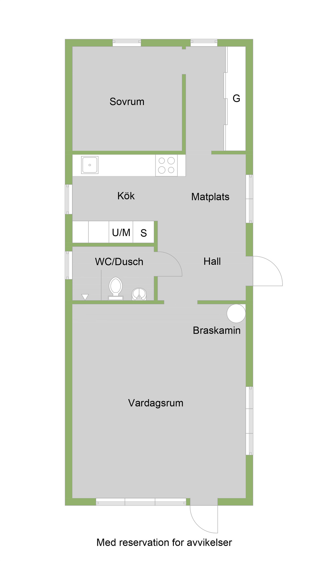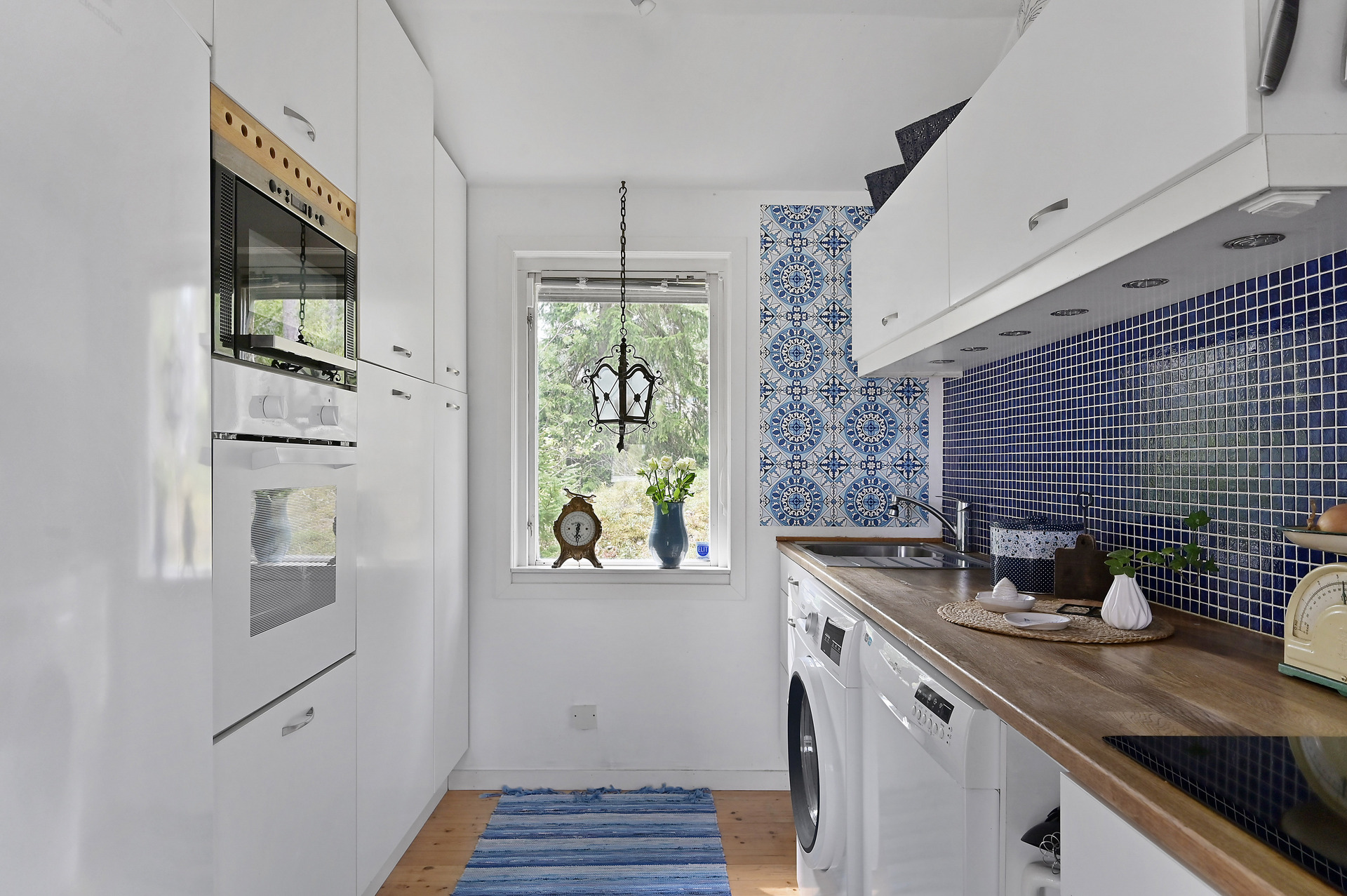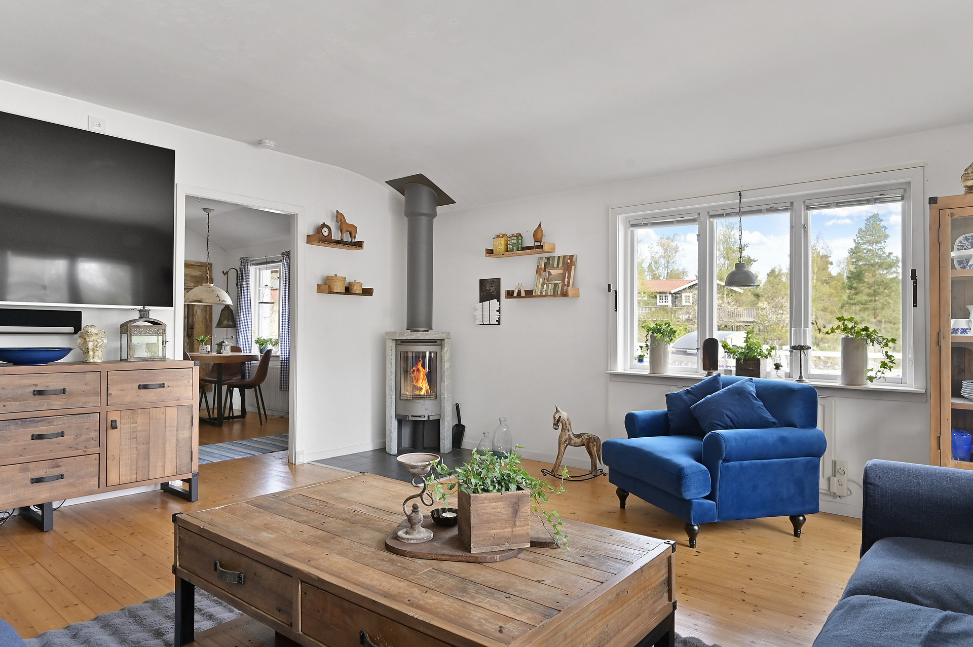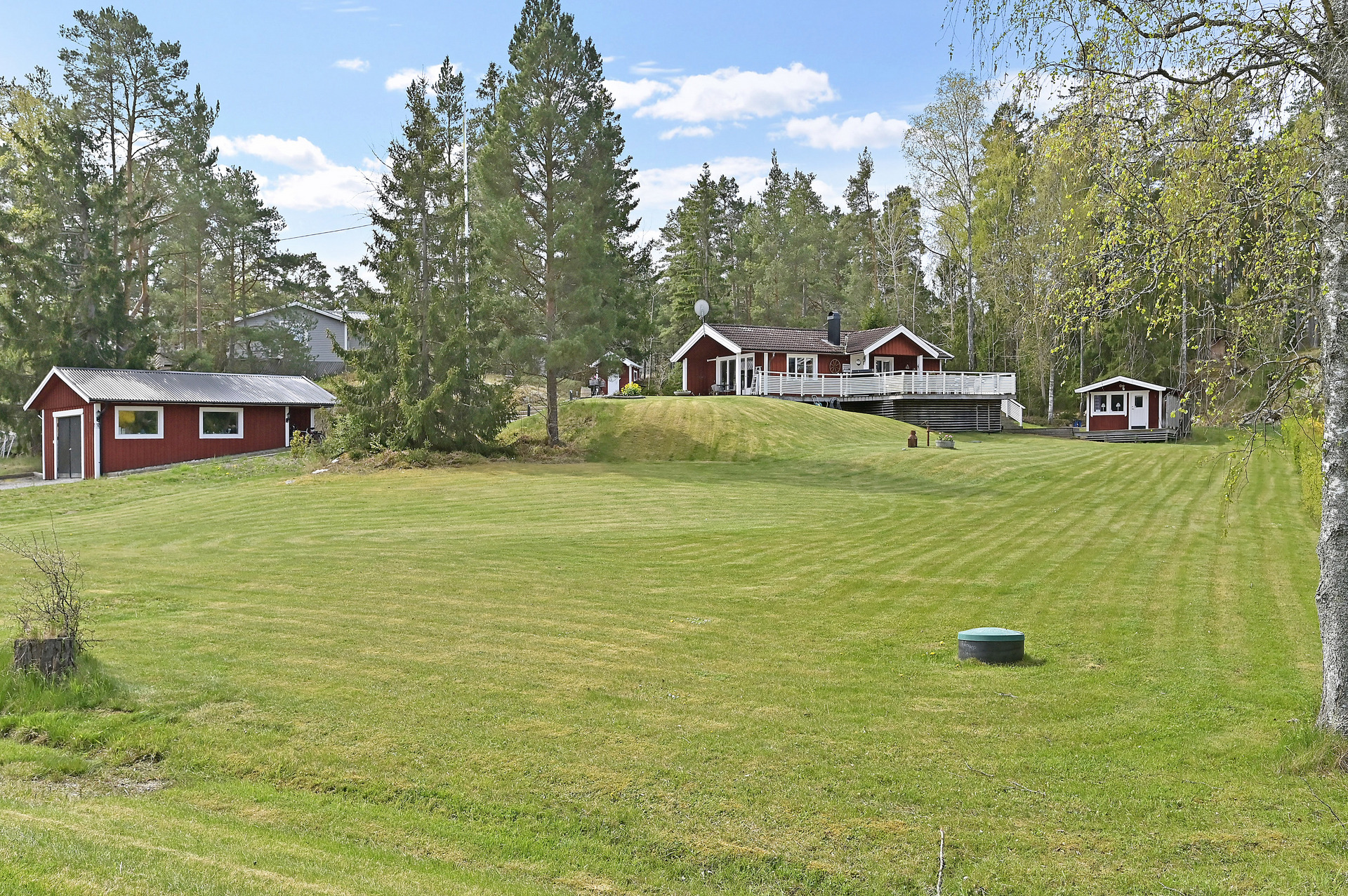 Öppen entré med kök och matplats. Här möts man av plankgolv och vitmålade väggar och tak med inslag av blå dekor. Köket är inrett med vit skåpinredning köksbänkar i ek med blå mosaik upp bakom spisfläkt och överskåp. Köket är utrustat med hel kyl, diskmaskin, spishäll med spisfläkt ovanför samt en tvättmaskin, längst in i köket finns ett fönster ut mot baksidan. I anslutning till köket finns en matplats vid fönster ut mot entrésidan. Till vänster om kök och entré finns ett stort luftigt vardagsrum med fönster i två väderstreck och ett stort fönsterparti samt utgång till altan som delvis är undertak. I vardagsrummet finns en fin braskamin som tillsammans med en luftvärmepump sprider värmen in i hela huset när man eldar, perfekt kalla vinterkvällar. Vardagsrummet har vitmålade väggar och plankgolv. Till höger om köket finns ett sovrum som nås via en "Walk in closet" med heltäckningsmatta och gott om förvaring bakom skjutbara dörrar längst ena väggen. I sovrummet finns plats för dubbelsäng och även här har man en heltäckningsmatta att värma fötterna på när man stiger upp på morgonen. Mellan kök och vardagsrum finns ett helkaklat badrum med dusch, badrummet renoverades i egen regi 2011 och har ett grått klinkergolv (el-golvvärme) med vitt kakel på väggarna och gråa kaklade detaljer. Här finns även tvättställ i kommod med spegelskåp ovanför, wc samt handdukstork. På baksidan om huset finns ett litet förrådsutrymme med hyllsystem, här står även frysen. Utförda renoveringar: Köket renoverat även flyttat en vägg år 2010 Badrummet renoverat med värmegolv Och handdukstork år 2010 Vardagsrummet renoverat 2010 Byte av kamin år 2010 Slipat alla golv år 2010 Byggt Gäststuga år 2011 Bytt panel och tilläggs isolerat huset år 2012 Byggt Altan år 2012 Lagt ny gräsmatta år 2014 Byggt 2 st förråd år 2018 Gjort trappa till entrén i Granitsten år 2021 Ny uppfart med Granit kantsten år 2021 Byggt garage påbörjat 2017 klart 2021 Sovrummet renoverat 2024
