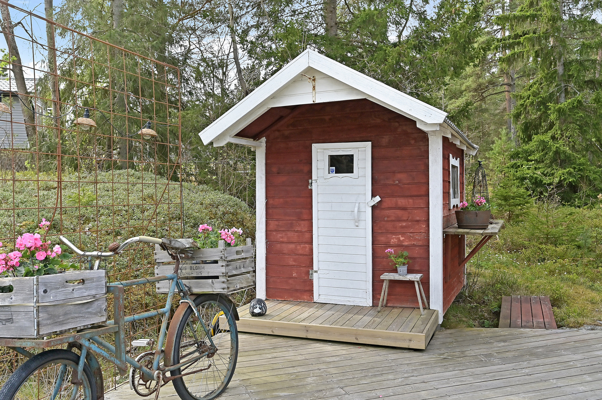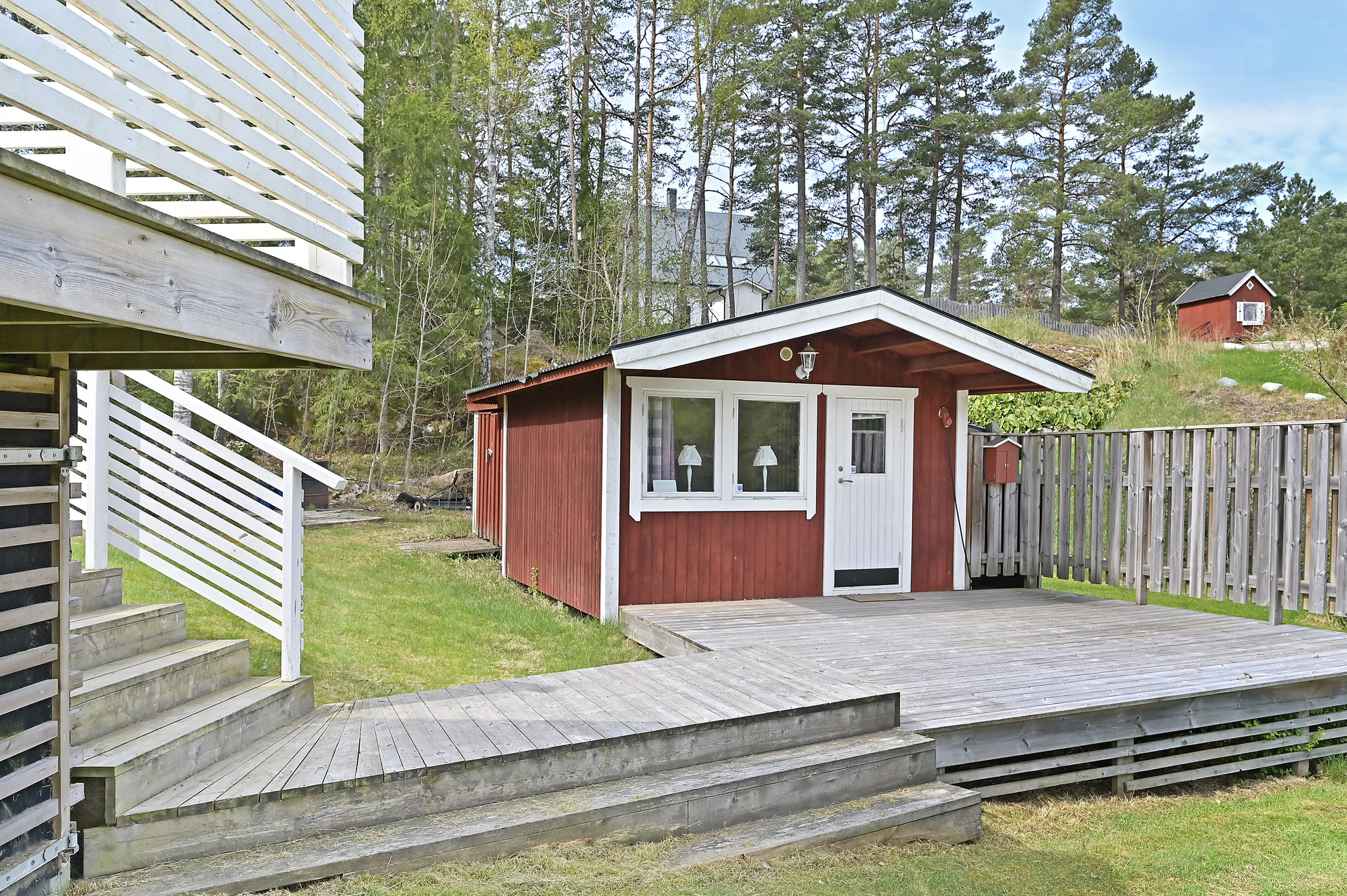 Fint litet gästhus byggt 2011 på ca 15 kvm med fint plankgolv och väggar klädda i vitmålad träpanel tillsammans med marinblått och vitt tyg spänt på väggarna. Bakom gästhuset finns en redskapsbod för trädgårdsverktyg, gräsklippare och annat som är bra att ha för trädgårdsskötsel. Garage om ca 50 kvm med gjuten platta byggstart 2017 klart 2021 med stora fina ytor för både bil och annan förvaring. Tomrör finns förberett i marken i det fall man önskar dra in vatten till garaget. På altanen finns ett litet sött förråd/lekstuga som i dag används för förvaring och intill huvudhuset finns ytterligare ett isolerat förråd där även frysen finns.