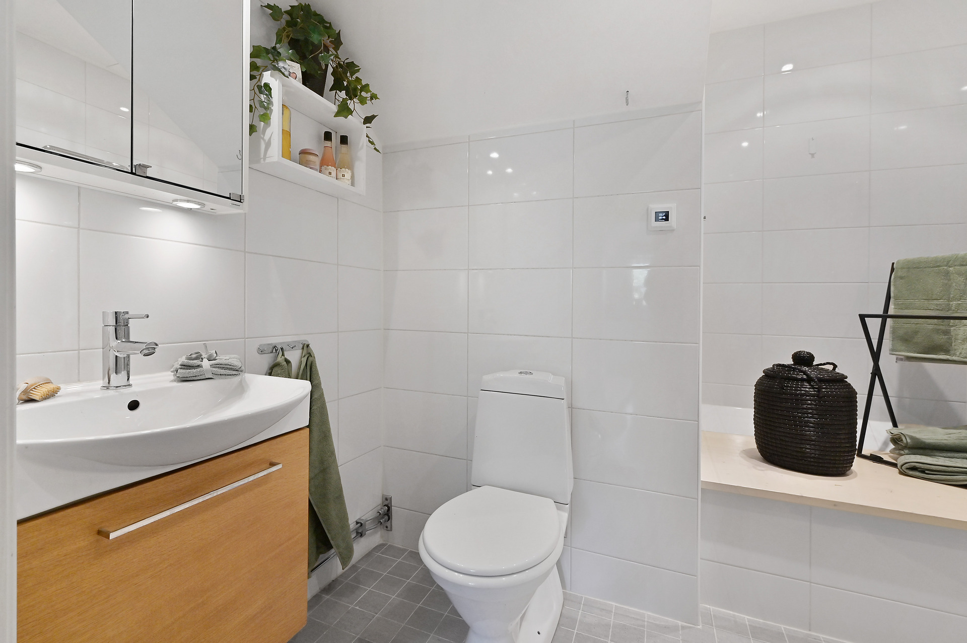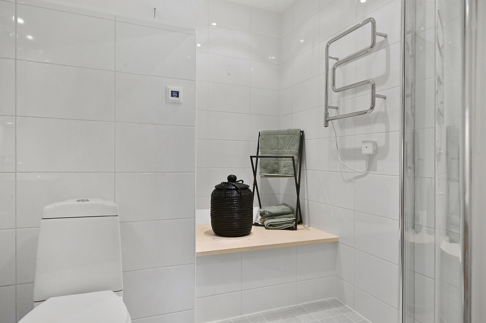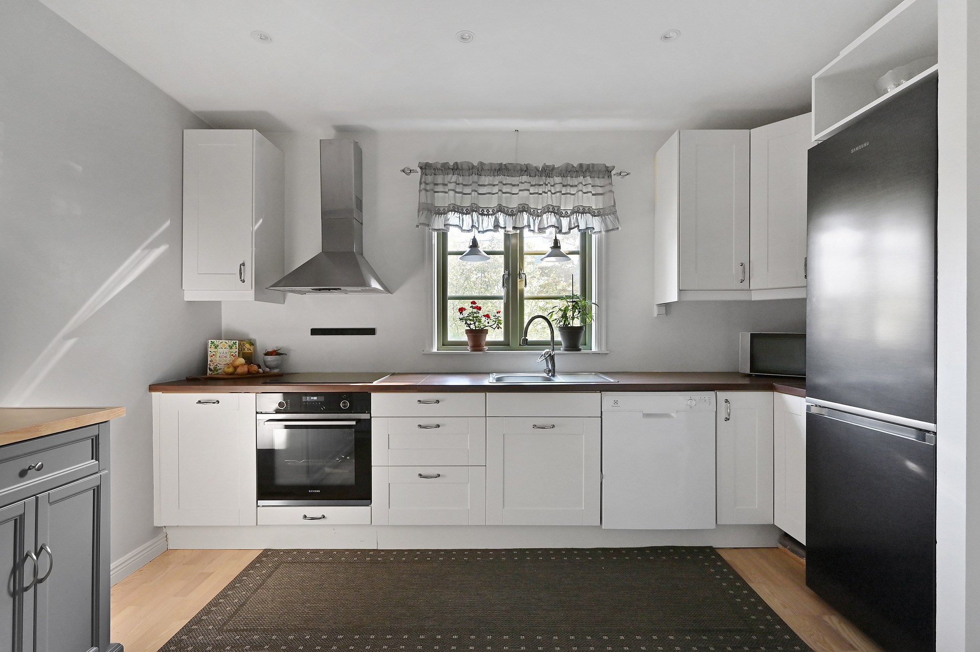 Några trappsteg upp har man en egen entré som välkomnar in i det ljusa fina köket med spröjsat fönster ovanför diskhon. Köket har vit köksinredning med vitt kakel och en träfärgad bänkskiva i laminat och spotlights i taket. Här finns spishäll med inbyggd ugn under och spisfläkt ovanför, kyl/frys och diskmaskin. Innanför köket finns en innerhall med spotlights i taket, garderob bakom skjutbara dörrar och plast för ytterkläder och skor. Både kök och innerhall har ljusa fina klickgolv i trä och väggarna är ljust målade. Här finns även det fint kaklade badrummet som har en ljus färgsättning, kommod med spegel ovanför, duschhörna bakom vikbara dörrar i glas och wc. I taket finns spotlights och på golvet är det el-golvvärme för härlig komfort. Vidare från innerhallen når man vardagsrum samt sovrum båda rummen har en tilltagen takhöjd och vackra spröjsade fönster. Vardagsrummet är rymligt hat har ett vackert murat fundament med möjlighet att installera en eldstad. Väggarna i rummet är målade i ljus kulör och på ena väggen finns en mönstrad fondtapet. På golvet har man ett stilrent enstavigt oak Antique golv tillsammans med allmogelister som slingar sig vidare in i det luftiga sovrummet. I sovrummet möts man av en en vacker kakelugn som med fördel används både för värme men även för 100% mysfaktor. I sovrummet finns plats för en stor dubbelsäng och annan förvaring om så önskas. Längst ena väggen finns garderober för optimal förvaring. Även detta rum har ljust målade väggar. Utförda renoveringar av tidigare ägare: 2020-2021 Renoverat badrum med el golvvärme Utförda renoveringar av nuvarande ägare 2023-2025 Klinker ingång, lister alla rum. Smyg ytterdörr. Gips vid kylskåp plus målning, hylla ovanför kyl, socklar mellan rum, låda vid ventilation hall Målning tak och väggar alla rum Nya golv vardagsrum och sovrum (nya golv finns till kök och hall och kan köpas till från säljaren) Nya golvlister Spackel målning efter nya fönster Tak hall efter ventilationen Sänkning tak kök och hall Spottar kök och hall Eldragning kök hall Tätning skorsten sovrum Glaslucka Kakelugn Lagning kakelugn Skorstenstätarna Värmdö Besiktning sotare plus provtryckning vardagsrum Flyttat ny vägg kök vid entré Element alla rum 2023-2024 Ny kyl- frys Samsung. Ny spishäll Siemens Ny ugn Siemens Tapet vardagsrummet Garderober sovrum Ikea Innerdörr glas Sweedoor 2025 Uteplats, pallkragar, jord, växter