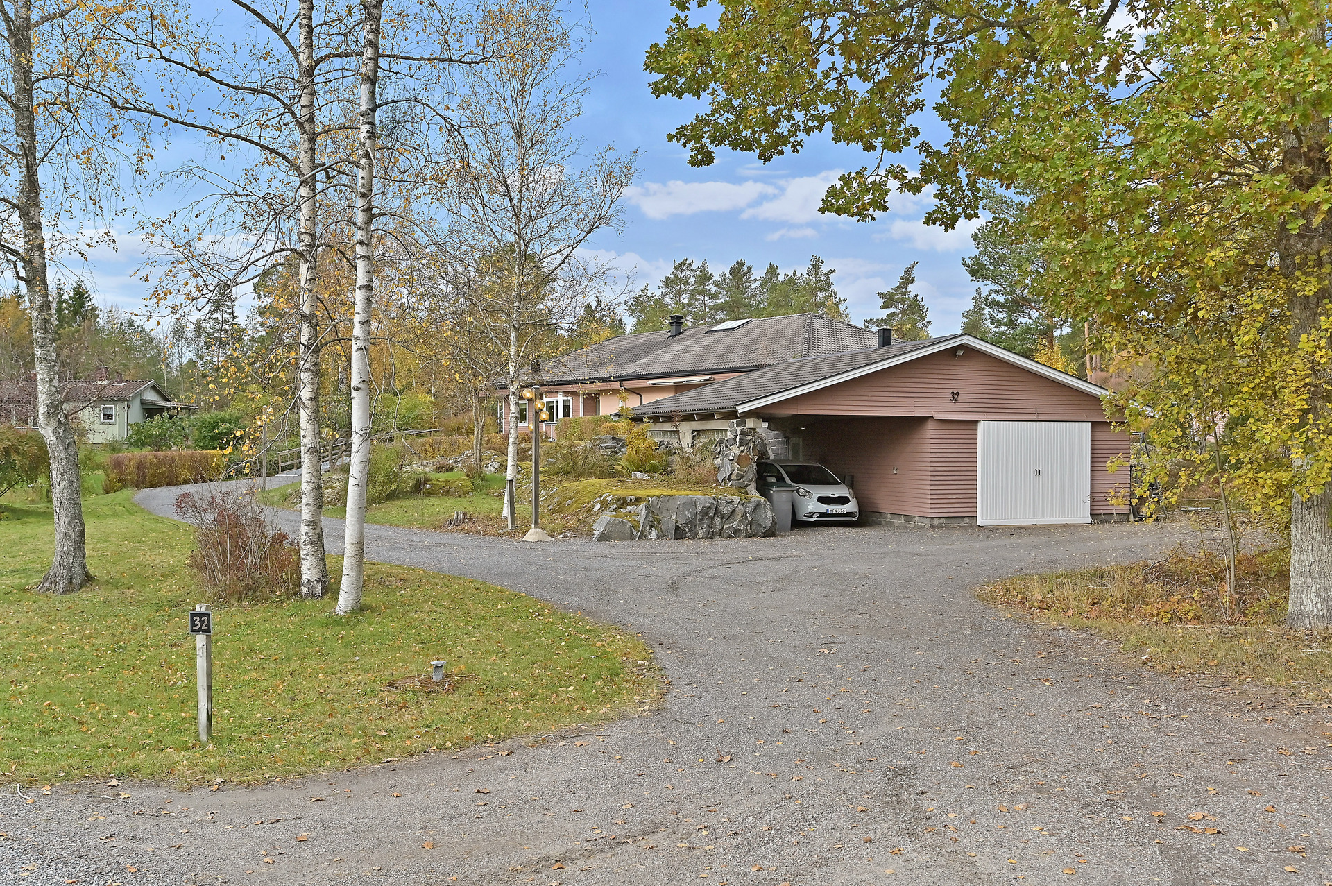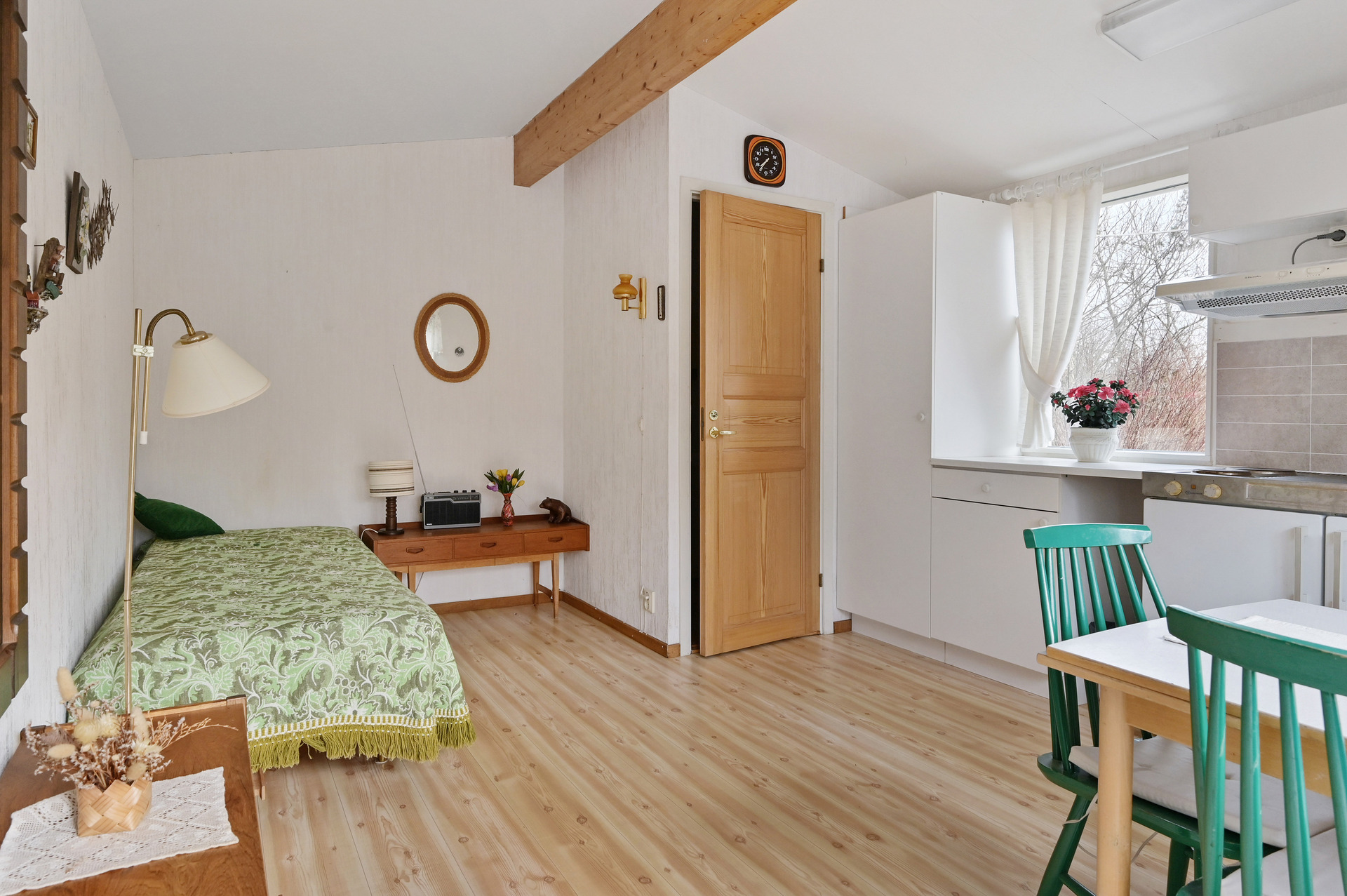 Garage+carport vid infarten med gott om plats. Finns även ett gästhus på baksidan vid dammen som är utrustat med mindre kök och wc.