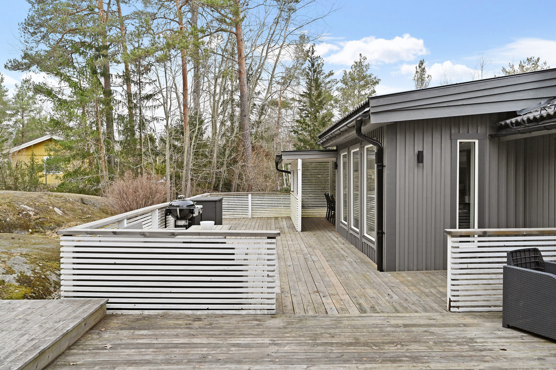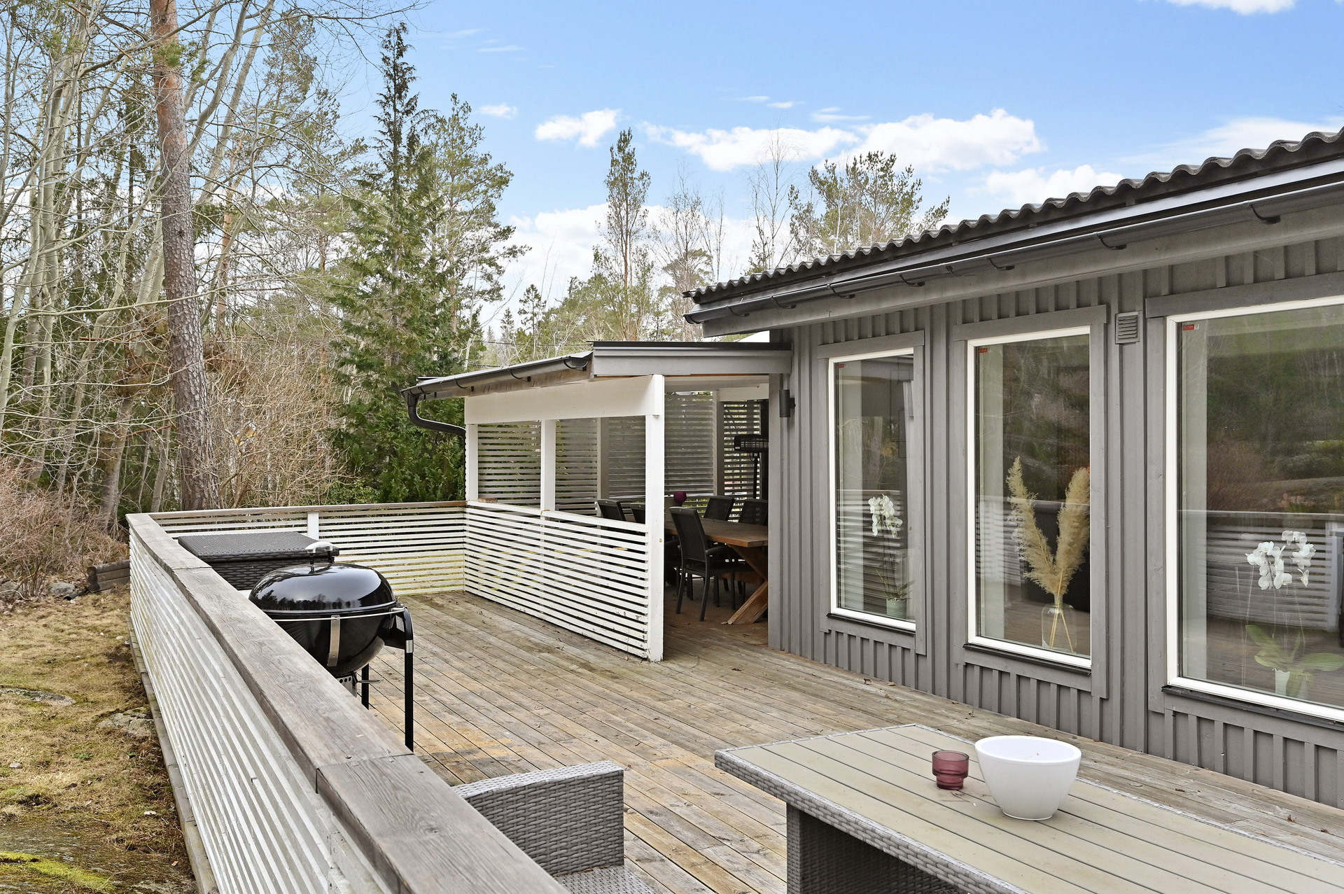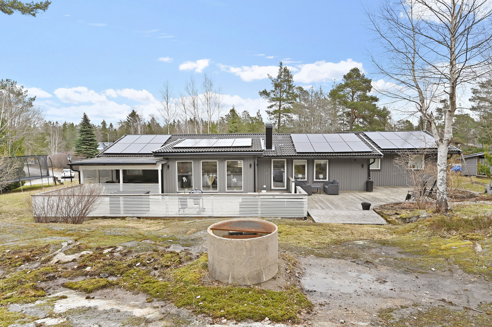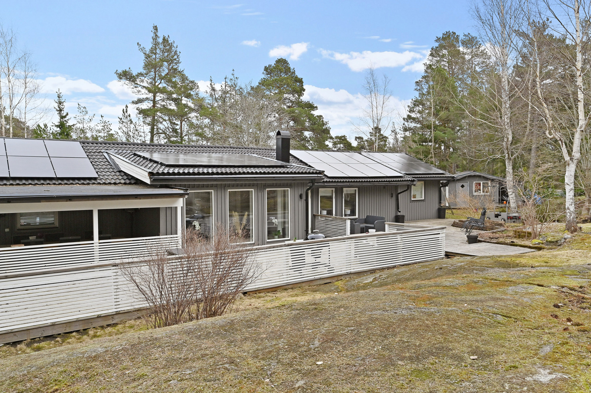 Renoverat och utbyggt 1-planshus med solceller, braskamin och insynsskyddade uteplatser