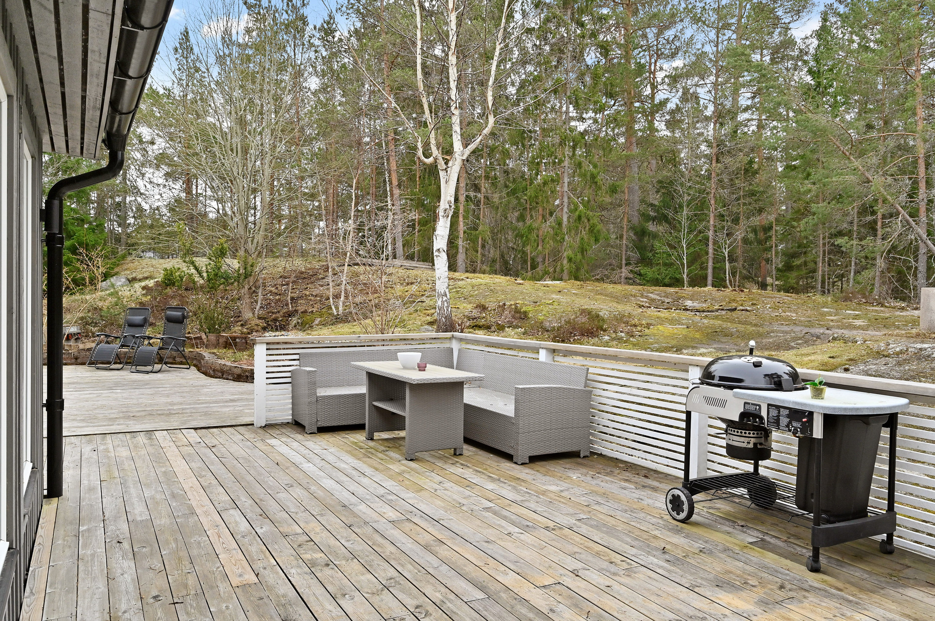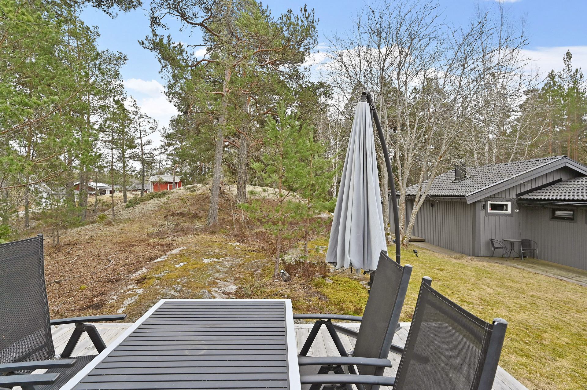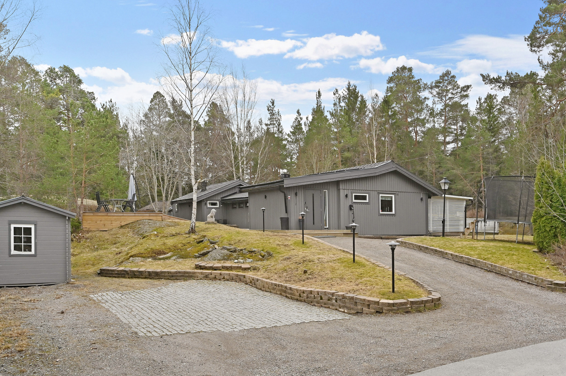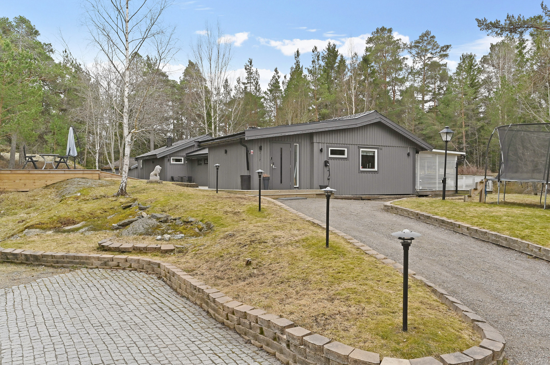 Renoverat och utbyggt 1-planshus med solceller, braskamin och insynsskyddade uteplatser