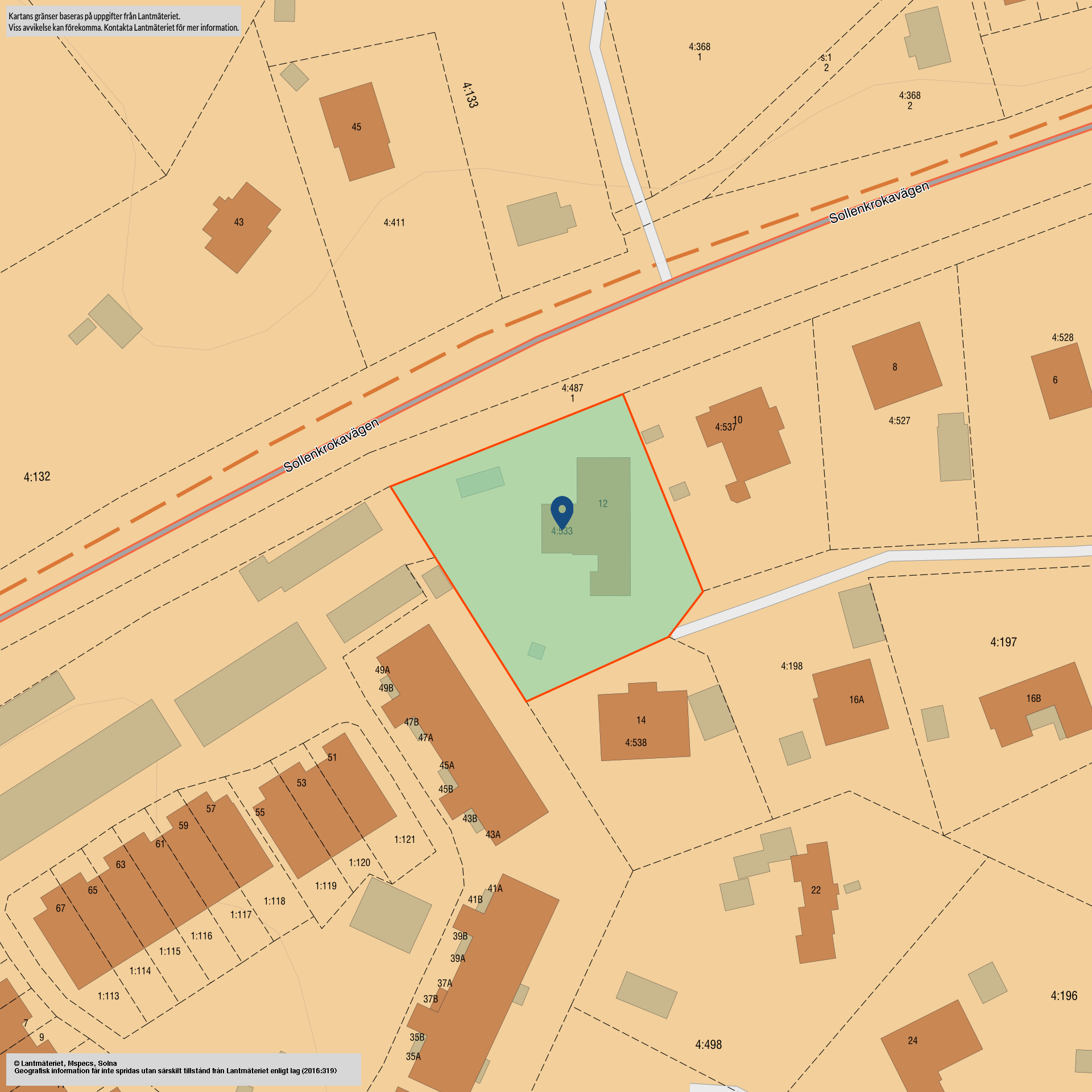 - Taxeringsvärde: Taxeringsvärdet är 4 492 000 SEK (fastställt 2024) varav byggnadsvärde 3 053 000 SEK och markvärde 1 439 000 SEK. Värdeår 1975.